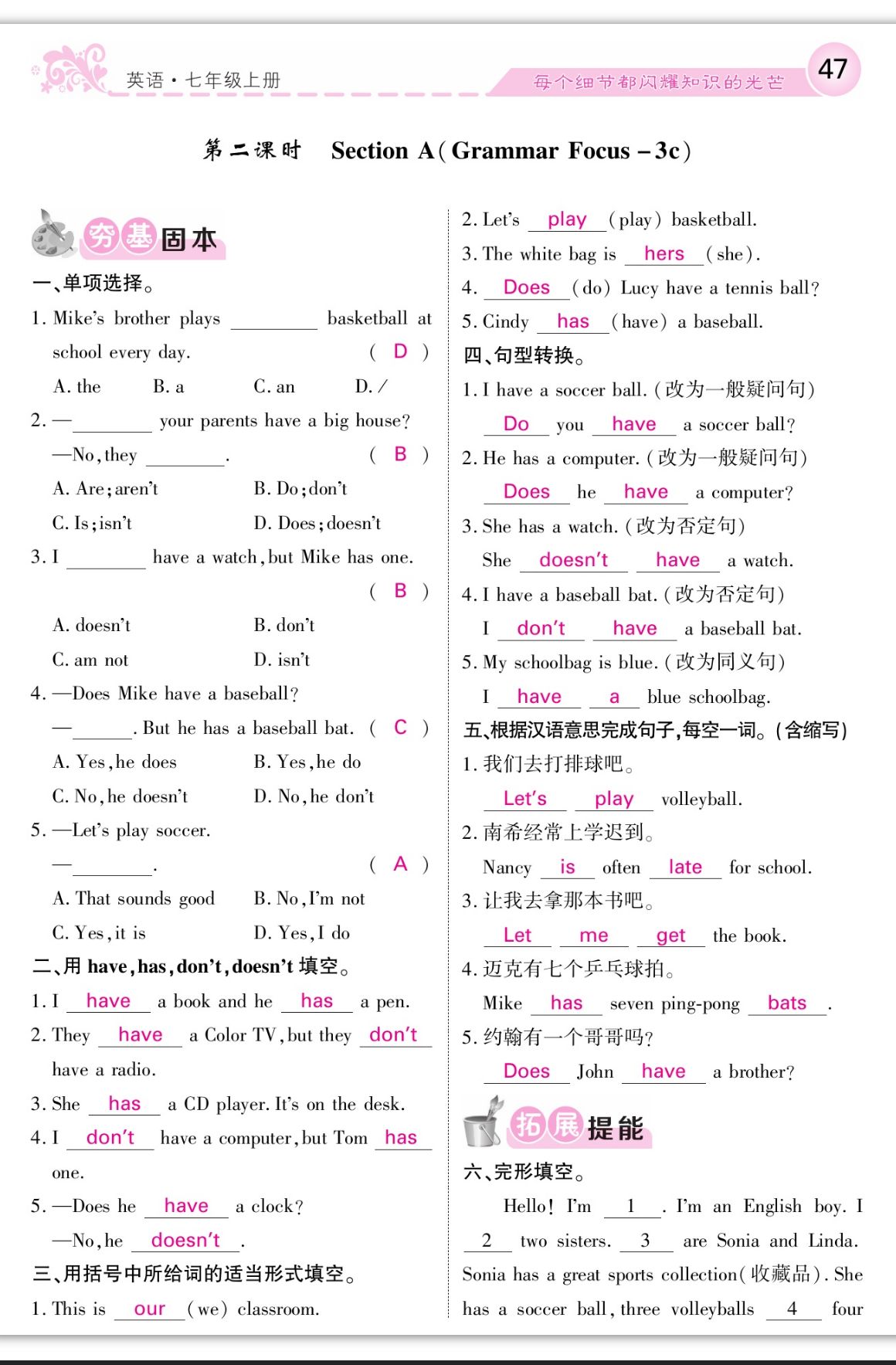 注:目前有些书本章节名称可能整理的还不是很完善,但都是按照顺序排列的,请同学们按照顺序仔细查找。练习册 2023年课堂点睛七年级英语上册人教版 答案主要是用来给同学们做完题方便对答案用的,请勿直接抄袭。
