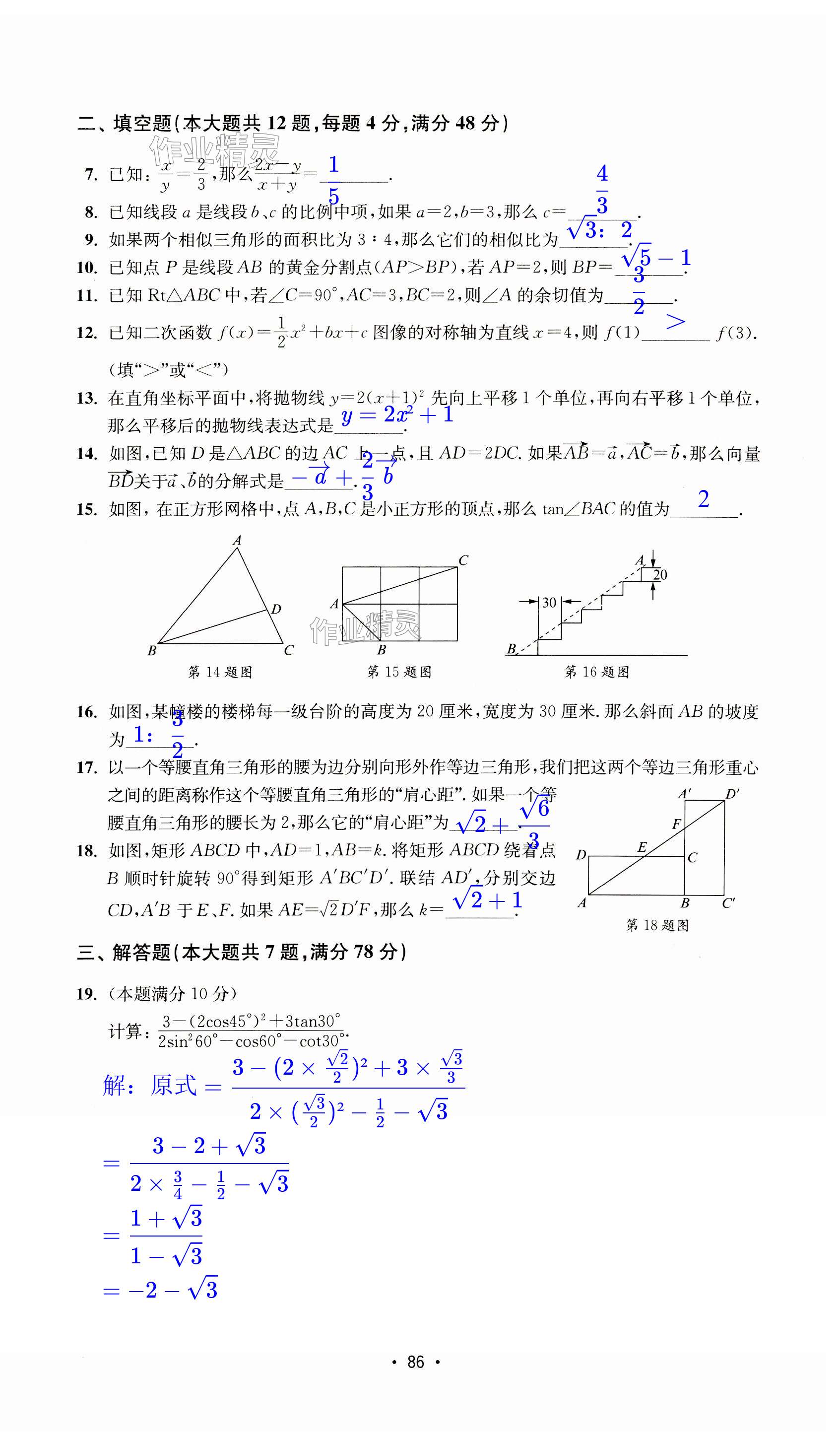 注:目前有些书本章节名称可能整理的还不是很完善,但都是按照顺序排列的,请同学们按照顺序仔细查找。练习册 2023年全优金典九年级数学全一册沪教版54制 答案主要是用来给同学们做完题方便对答案用的,请勿直接抄袭。
