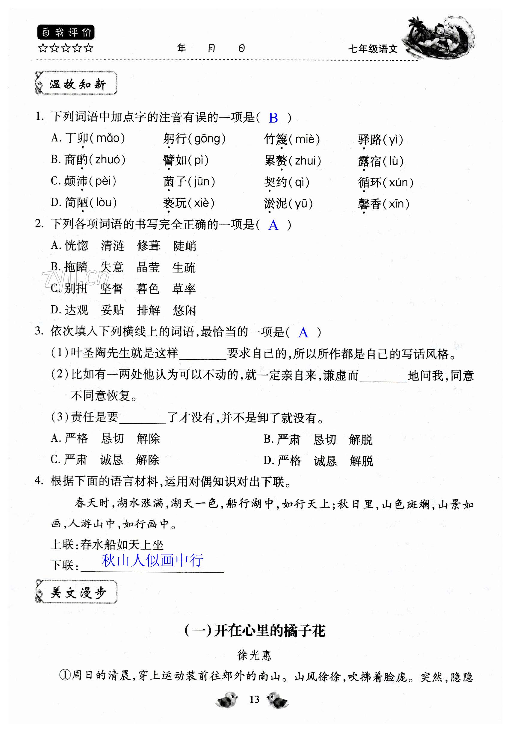 注:目前有些书本章节名称可能整理的还不是很完善,但都是按照顺序排列的,请同学们按照顺序仔细查找。练习册 2023年世超金典暑假乐园暑假七年级语文 答案主要是用来给同学们做完题方便对答案用的,请勿直接抄袭。