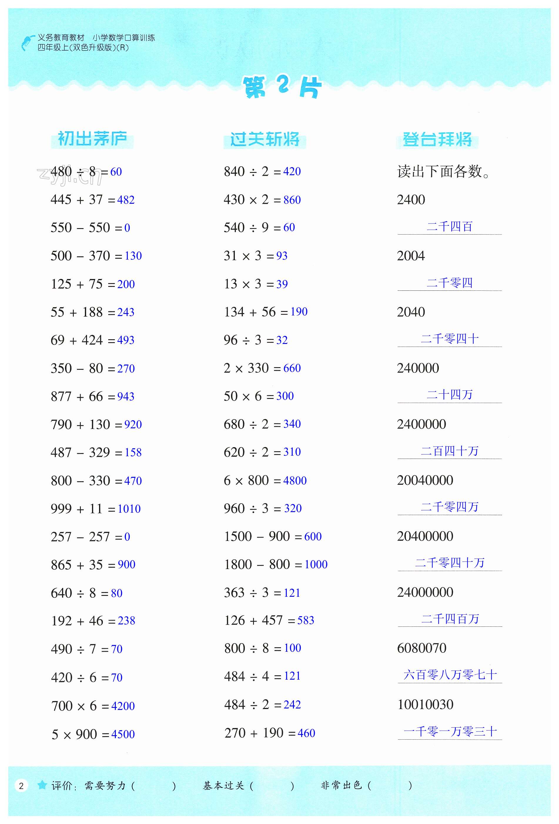 注:目前有些书本章节名称可能整理的还不是很完善,但都是按照顺序排列的,请同学们按照顺序仔细查找。练习册 2023年口算训练四年级数学上册人教版升级版 答案主要是用来给同学们做完题方便对答案用的,请勿直接抄袭。