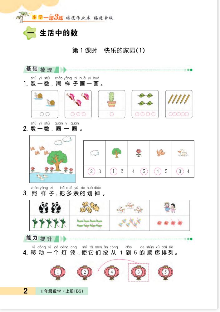 注:目前有些书本章节名称可能整理的还不是很完善,但都是按照顺序排列的,请同学们按照顺序仔细查找。练习册 2023年一课3练培优作业本一年级数学上册北师大版福建专版 答案主要是用来给同学们做完题方便对答案用的,请勿直接抄袭。