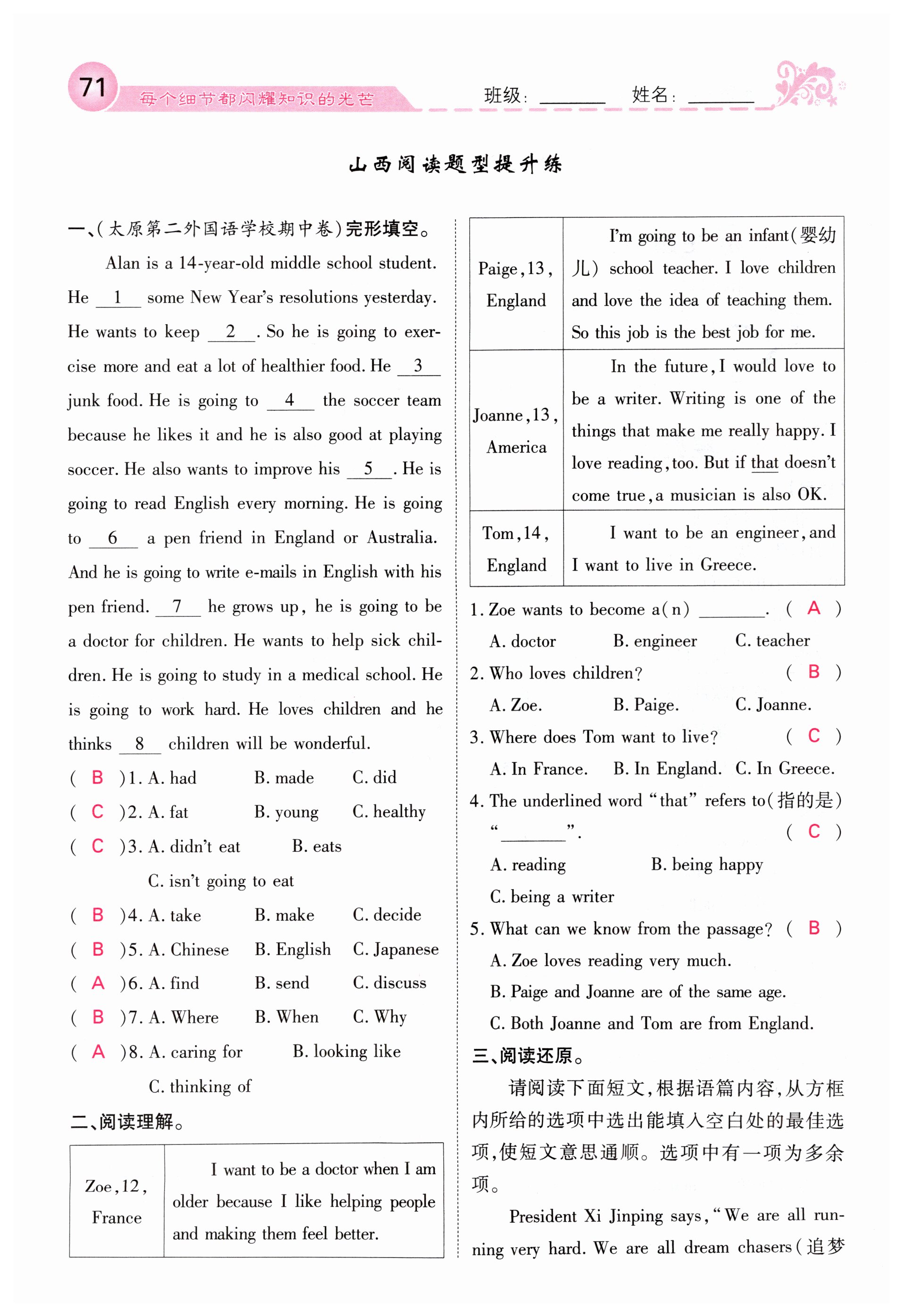 注:目前有些书本章节名称可能整理的还不是很完善,但都是按照顺序排列的,请同学们按照顺序仔细查找。练习册 2023年课堂点睛八年级英语上册人教版山西专版 答案主要是用来给同学们做完题方便对答案用的,请勿直接抄袭。