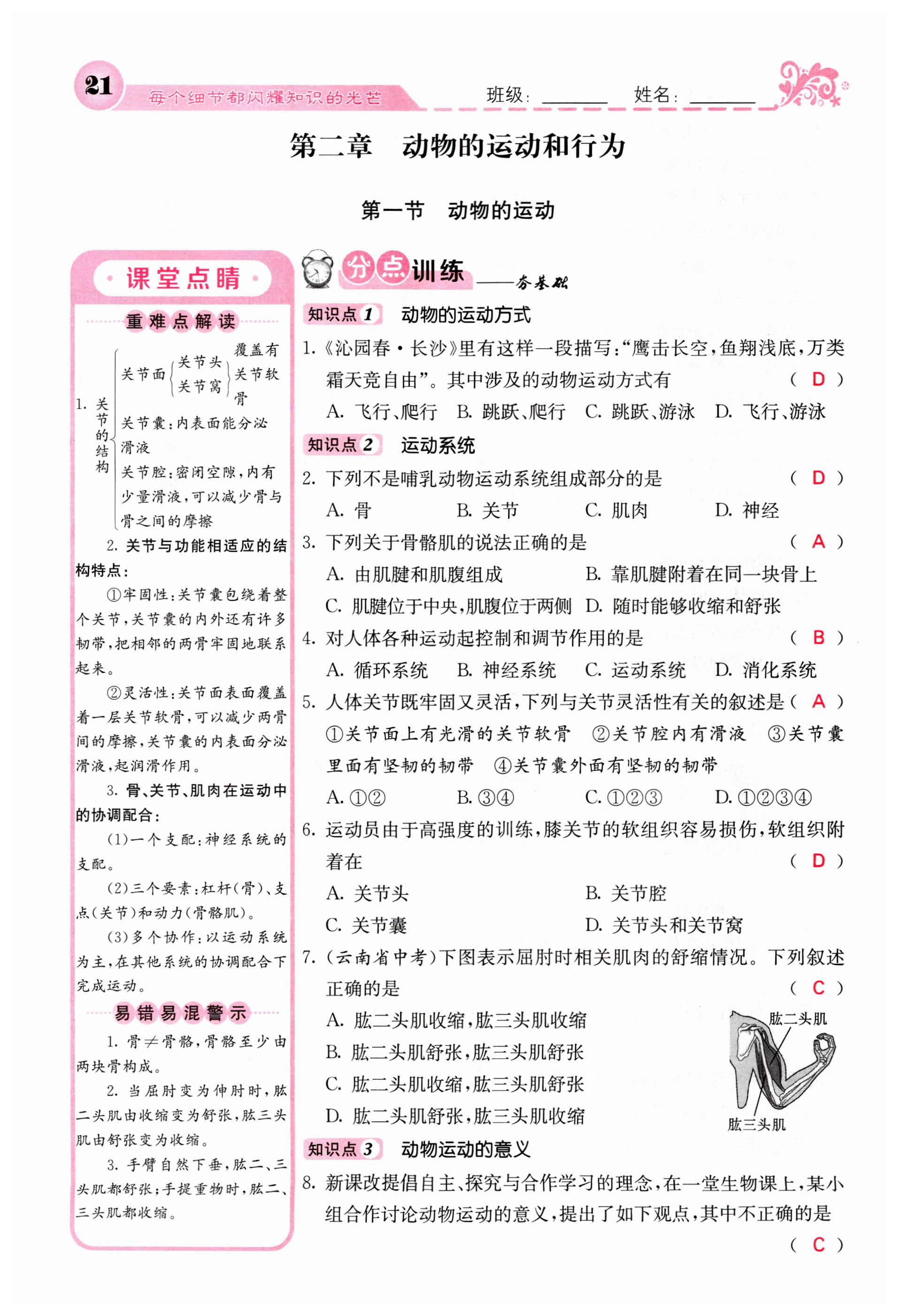 注:目前有些书本章节名称可能整理的还不是很完善,但都是按照顺序排列的,请同学们按照顺序仔细查找。练习册 2023年课堂点睛八年级生物上册人教版 答案主要是用来给同学们做完题方便对答案用的,请勿直接抄袭。