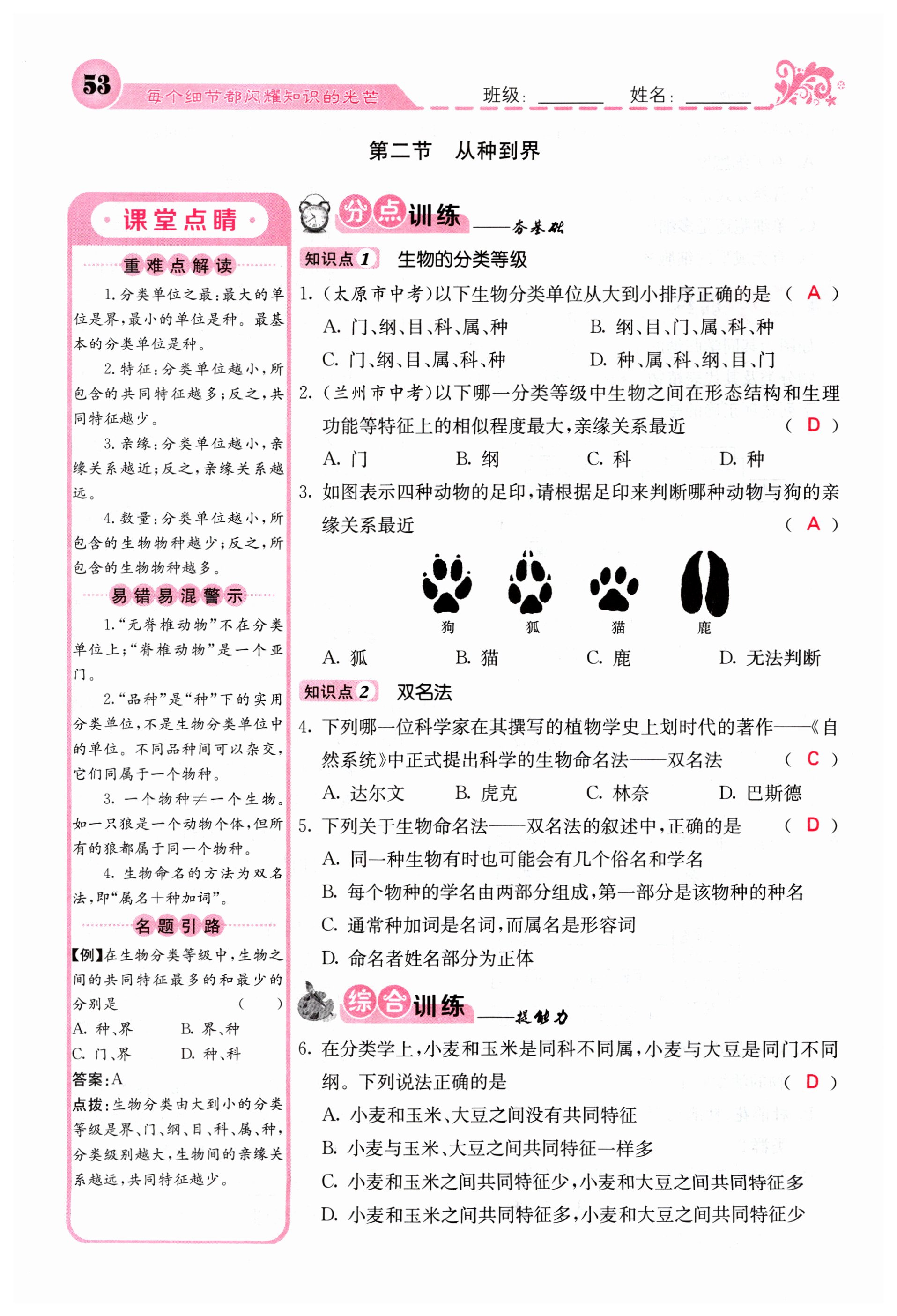 注:目前有些书本章节名称可能整理的还不是很完善,但都是按照顺序排列的,请同学们按照顺序仔细查找。练习册 2023年课堂点睛八年级生物上册人教版 答案主要是用来给同学们做完题方便对答案用的,请勿直接抄袭。