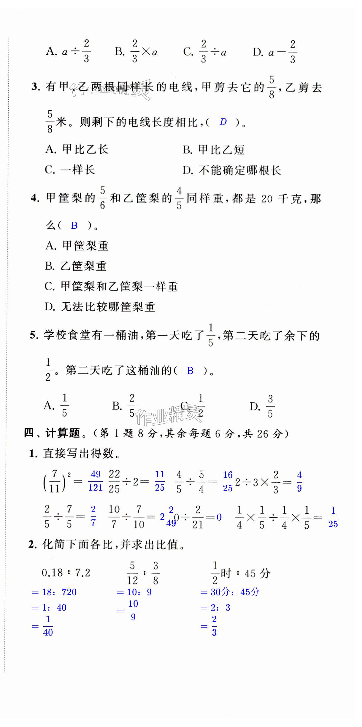 注:目前有些书本章节名称可能整理的还不是很完善,但都是按照顺序排列的,请同学们按照顺序仔细查找。练习册 2023年配套单元评价六年级数学上册苏教版 答案主要是用来给同学们做完题方便对答案用的,请勿直接抄袭。