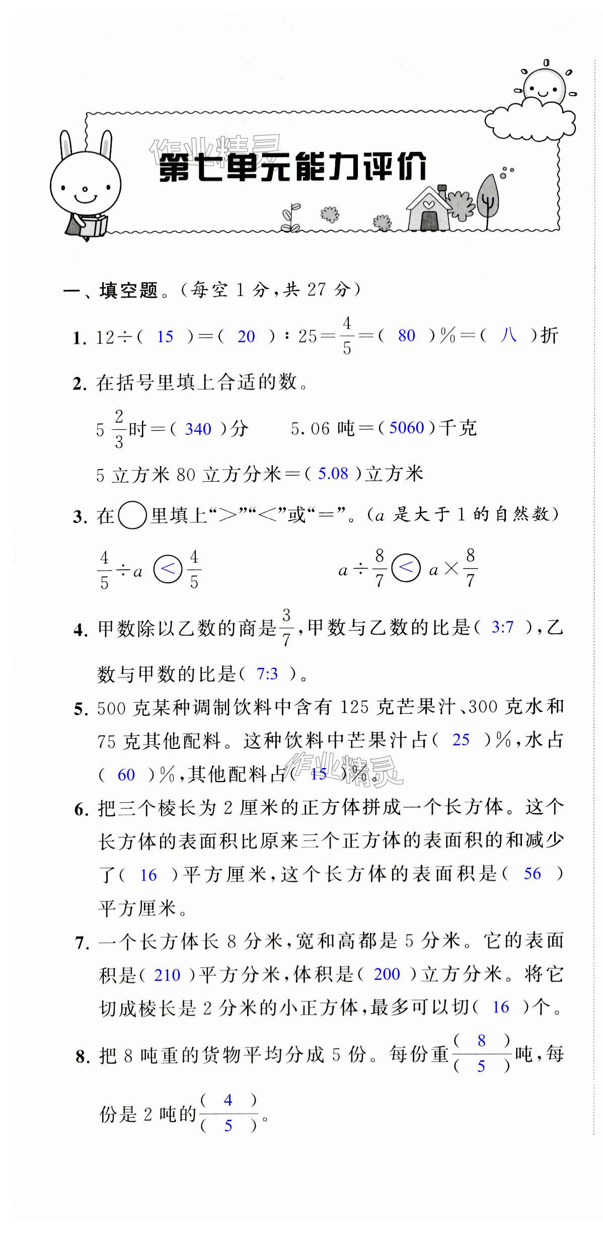 注:目前有些书本章节名称可能整理的还不是很完善,但都是按照顺序排列的,请同学们按照顺序仔细查找。练习册 2023年配套单元评价六年级数学上册苏教版 答案主要是用来给同学们做完题方便对答案用的,请勿直接抄袭。