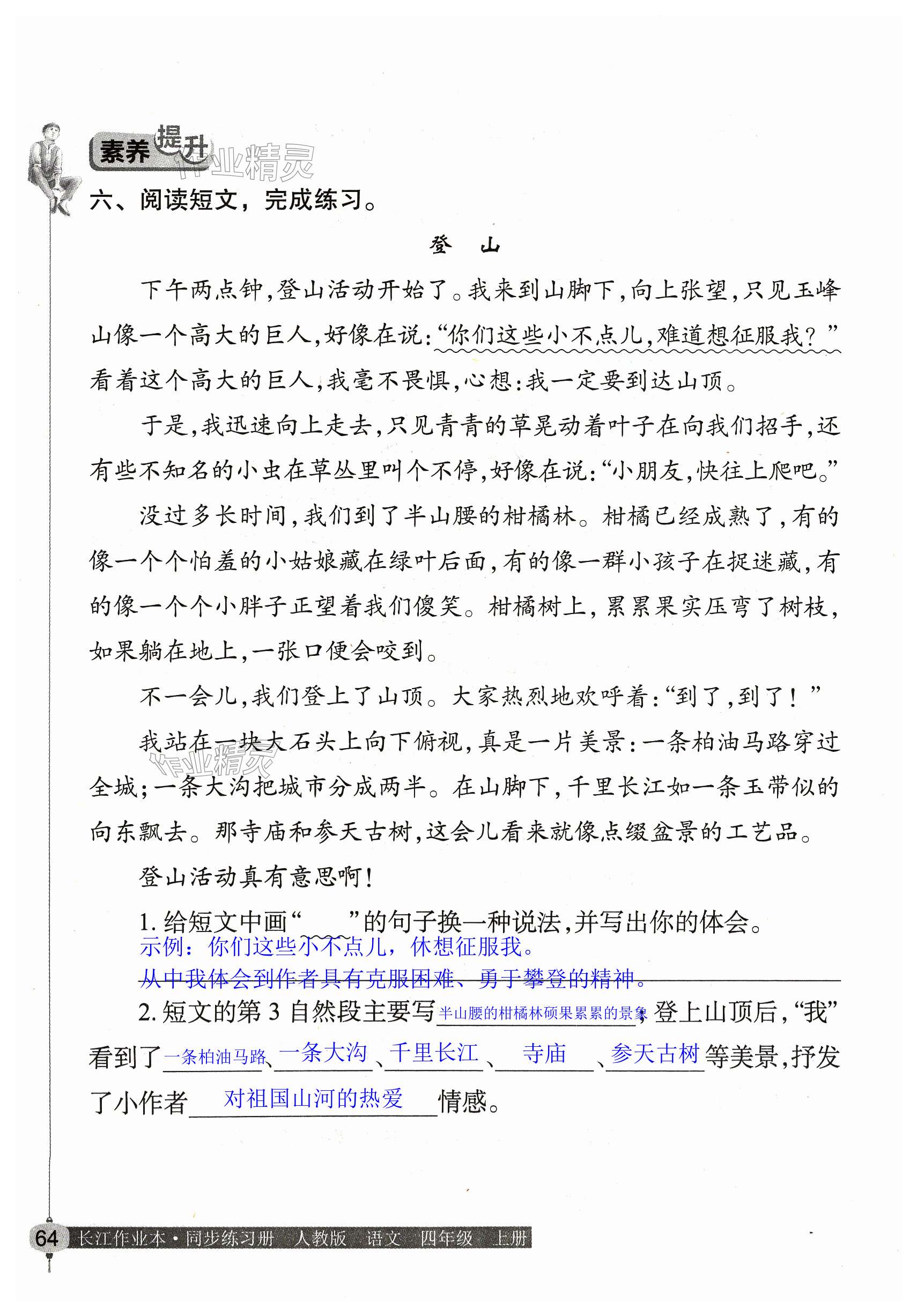 注:目前有些书本章节名称可能整理的还不是很完善,但都是按照顺序排列的,请同学们按照顺序仔细查找。练习册 2023年长江作业本同步练习册四年级语文上册人教版 答案主要是用来给同学们做完题方便对答案用的,请勿直接抄袭。