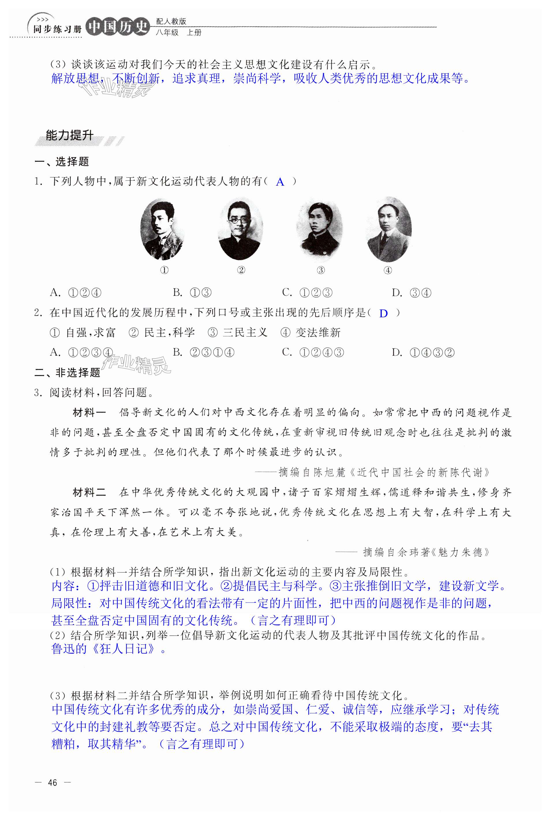 注:目前有些书本章节名称可能整理的还不是很完善,但都是按照顺序排列的,请同学们按照顺序仔细查找。练习册 2023年中国历史同步练习册八年级上册人教版 答案主要是用来给同学们做完题方便对答案用的,请勿直接抄袭。