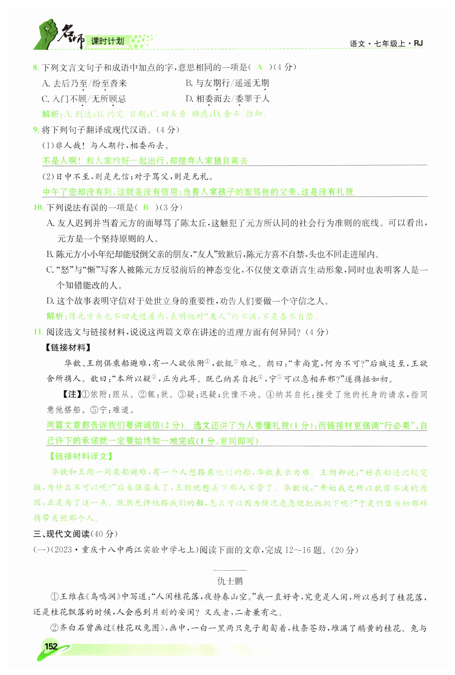 注:目前有些书本章节名称可能整理的还不是很完善,但都是按照顺序排列的,请同学们按照顺序仔细查找。练习册 2023年名师课时计划七年级语文上册人教版 答案主要是用来给同学们做完题方便对答案用的,请勿直接抄袭。