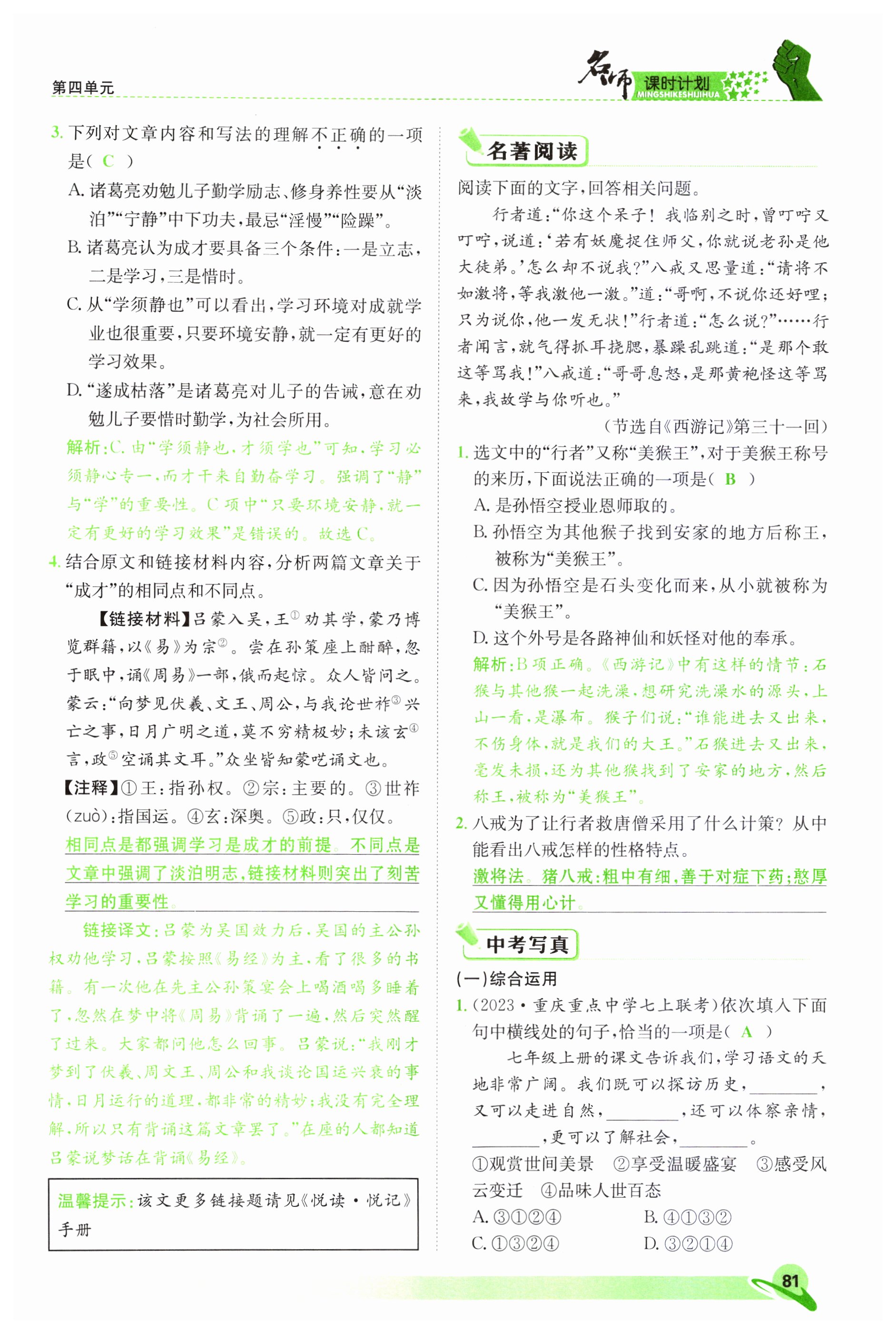 注:目前有些书本章节名称可能整理的还不是很完善,但都是按照顺序排列的,请同学们按照顺序仔细查找。练习册 2023年名师课时计划七年级语文上册人教版 答案主要是用来给同学们做完题方便对答案用的,请勿直接抄袭。