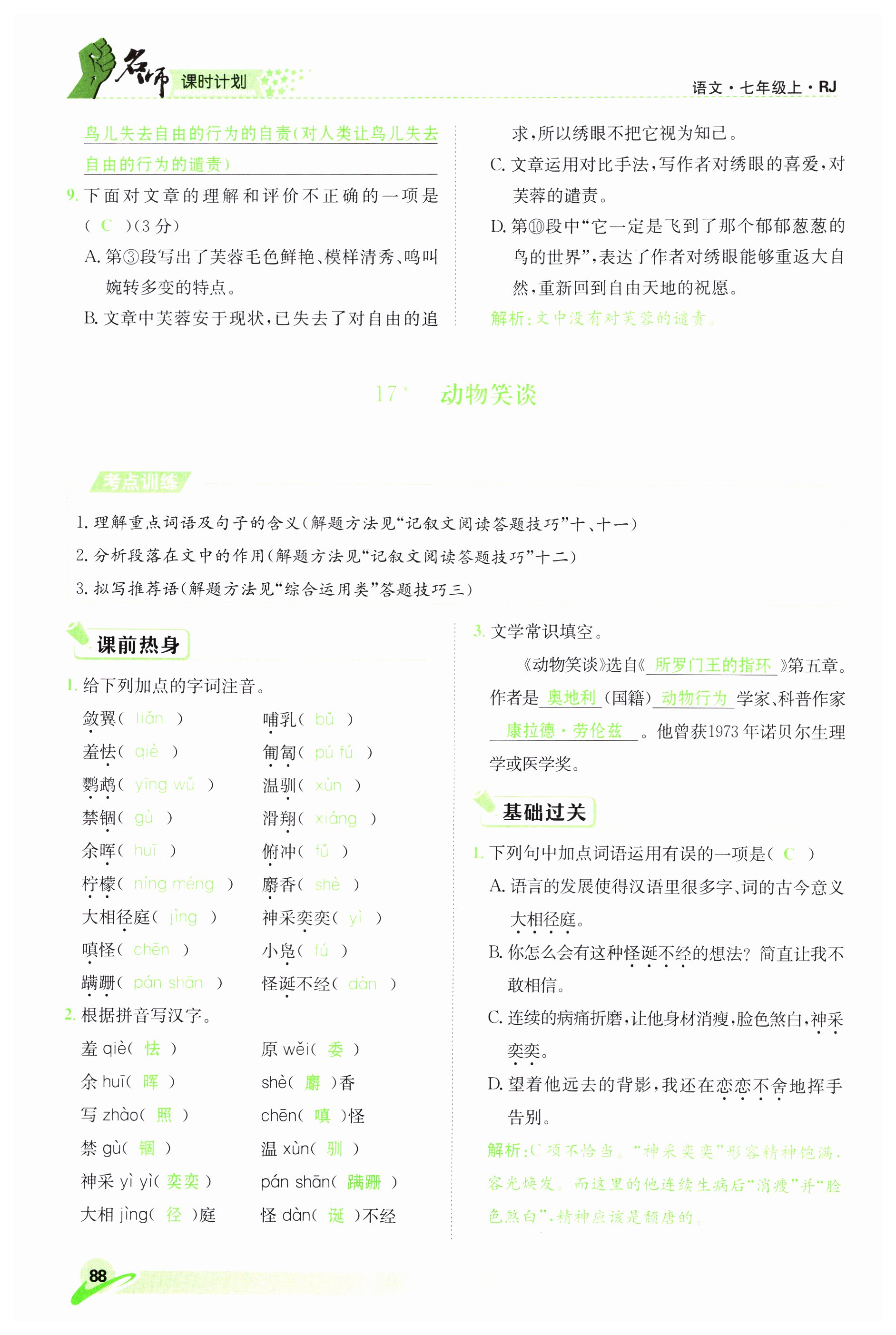 注:目前有些书本章节名称可能整理的还不是很完善,但都是按照顺序排列的,请同学们按照顺序仔细查找。练习册 2023年名师课时计划七年级语文上册人教版 答案主要是用来给同学们做完题方便对答案用的,请勿直接抄袭。
