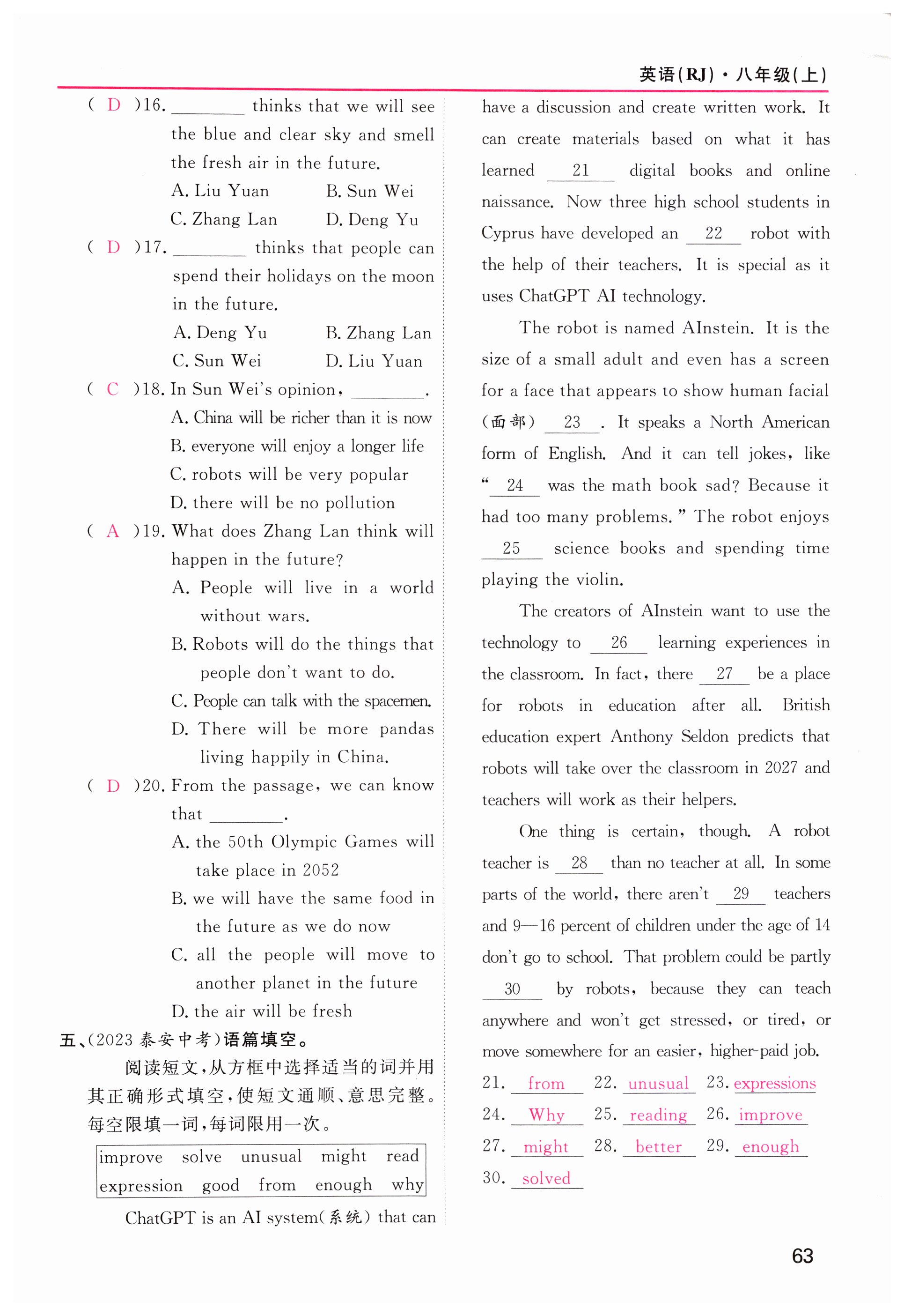 注:目前有些书本章节名称可能整理的还不是很完善,但都是按照顺序排列的,请同学们按照顺序仔细查找。练习册 2023年我的作业八年级英语上册人教版河南专版 答案主要是用来给同学们做完题方便对答案用的,请勿直接抄袭。