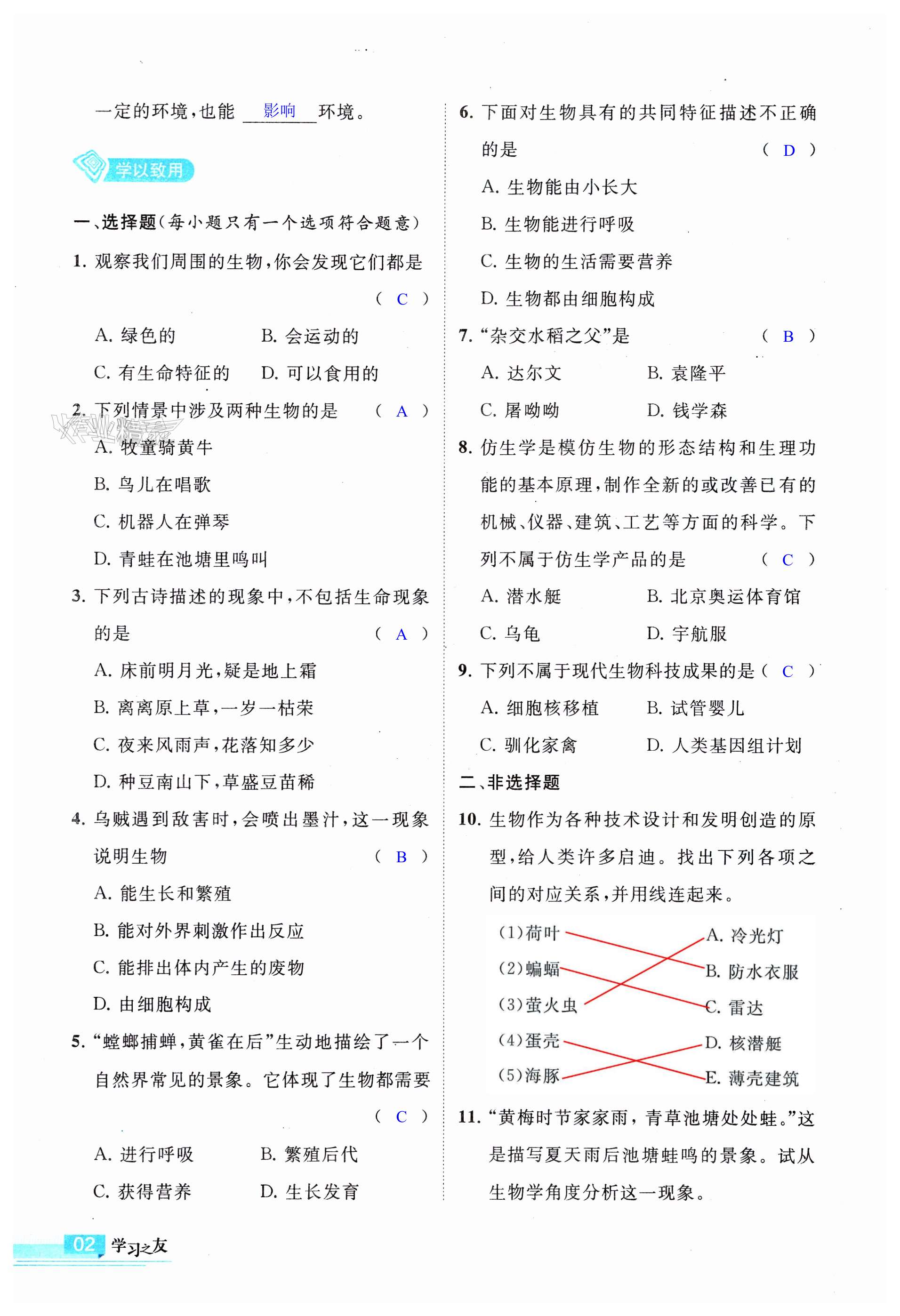 注:目前有些书本章节名称可能整理的还不是很完善,但都是按照顺序排列的,请同学们按照顺序仔细查找。练习册 2023年学习之友七年级生物上册苏科版 答案主要是用来给同学们做完题方便对答案用的,请勿直接抄袭。