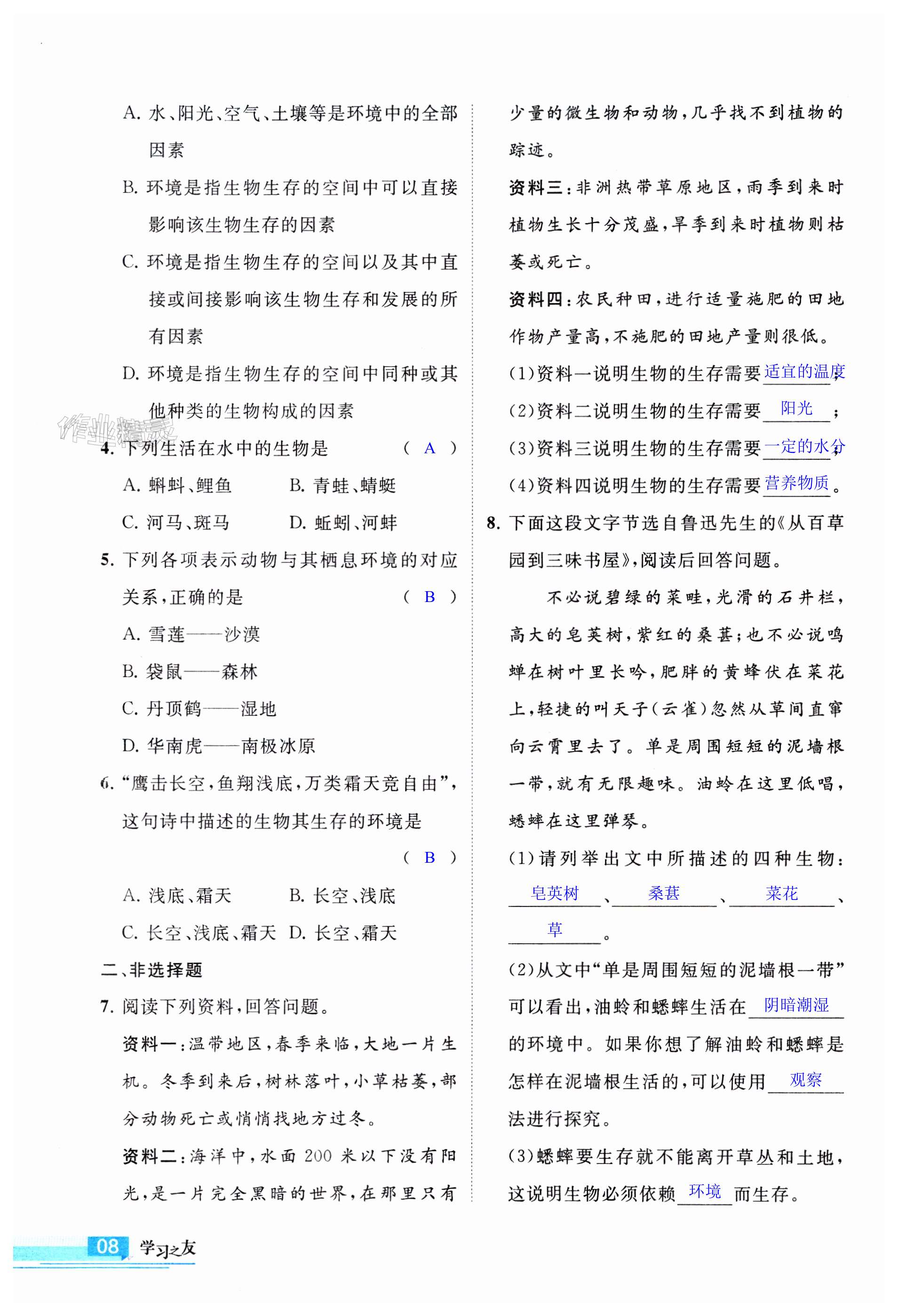 注:目前有些书本章节名称可能整理的还不是很完善,但都是按照顺序排列的,请同学们按照顺序仔细查找。练习册 2023年学习之友七年级生物上册苏科版 答案主要是用来给同学们做完题方便对答案用的,请勿直接抄袭。