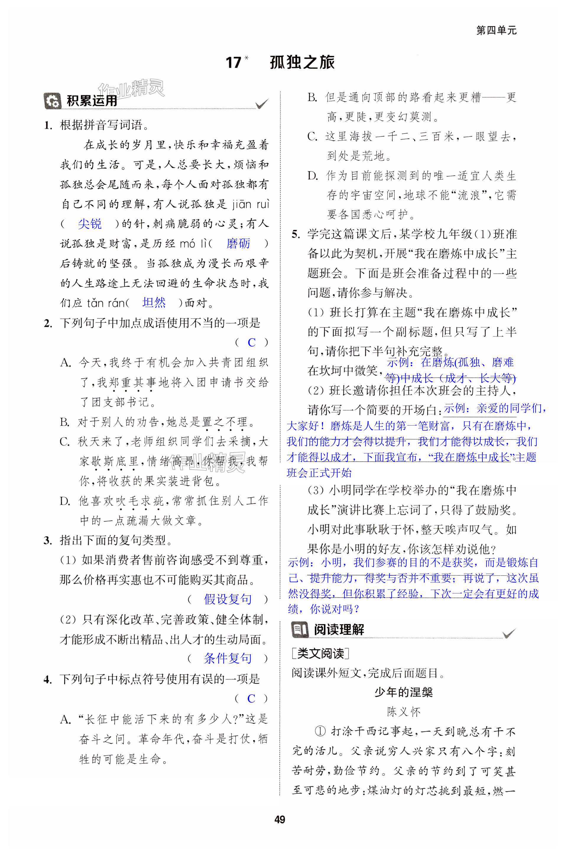 注:目前有些书本章节名称可能整理的还不是很完善,但都是按照顺序排列的,请同学们按照顺序仔细查找。练习册 2023年金钥匙课时学案作业本九年级语文上册人教版 答案主要是用来给同学们做完题方便对答案用的,请勿直接抄袭。