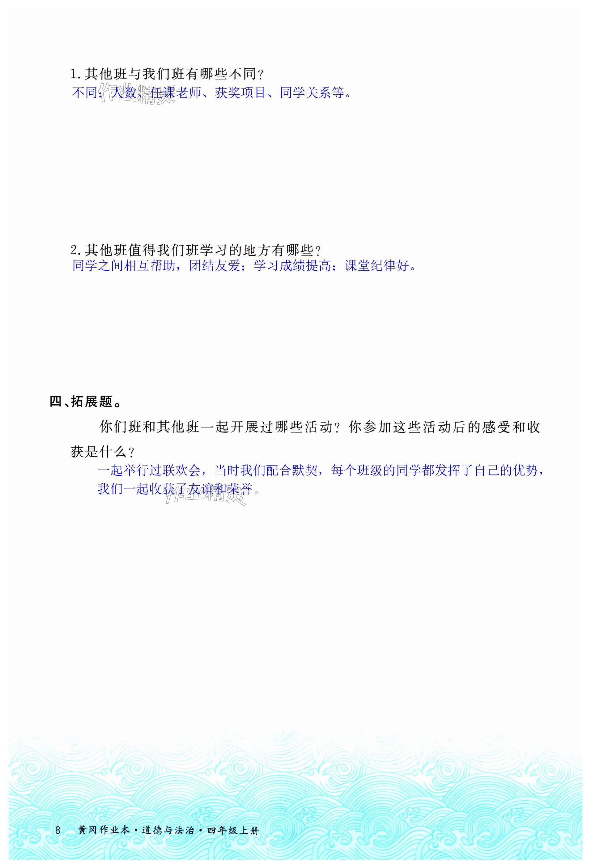 注:目前有些书本章节名称可能整理的还不是很完善,但都是按照顺序排列的,请同学们按照顺序仔细查找。练习册 2023年黄冈作业本武汉大学出版社四年级道德与法治上册人教版 答案主要是用来给同学们做完题方便对答案用的,请勿直接抄袭。