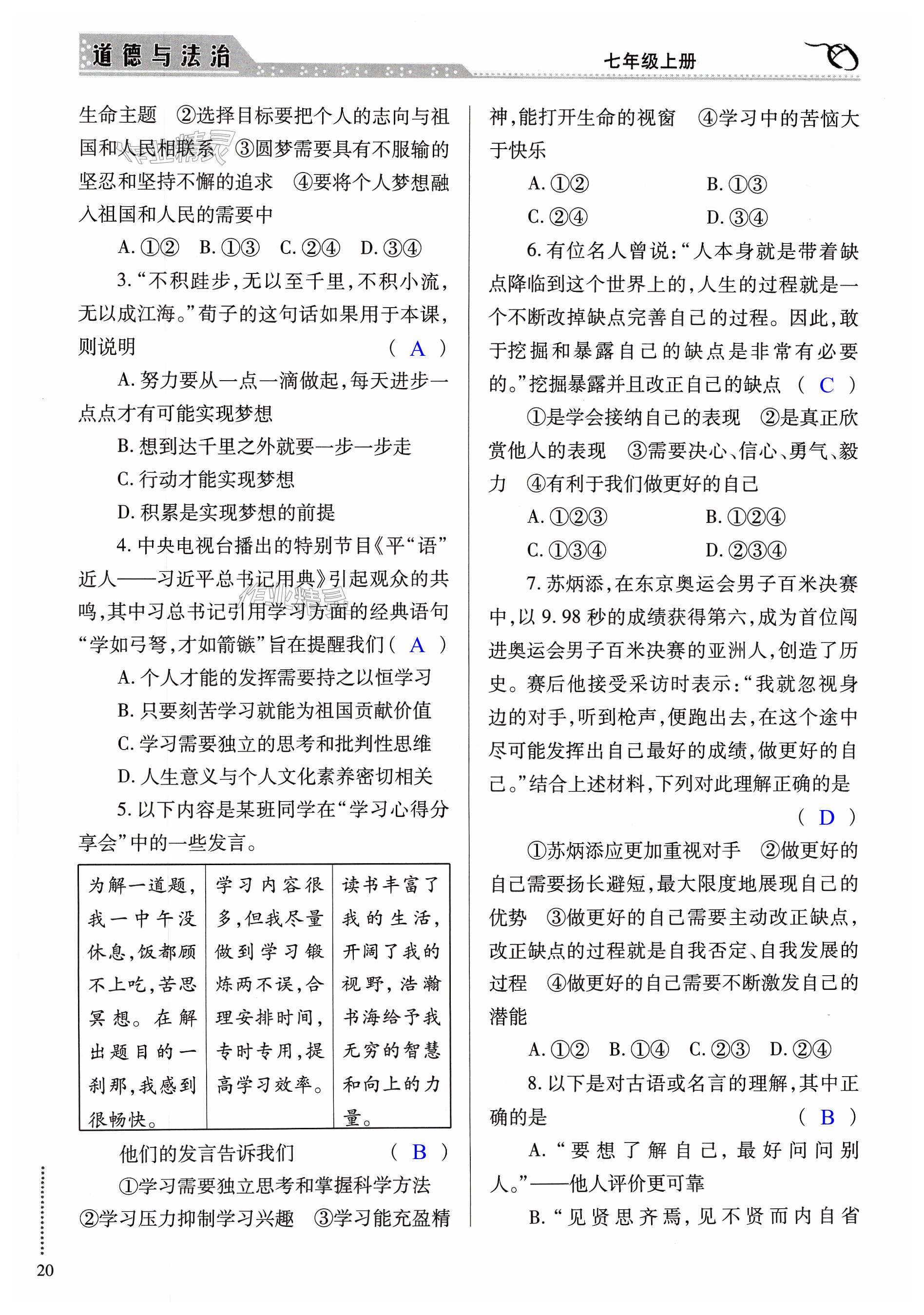 注:目前有些书本章节名称可能整理的还不是很完善,但都是按照顺序排列的,请同学们按照顺序仔细查找。练习册 2023年智慧学习导学练七年级道德与法治上册人教版 答案主要是用来给同学们做完题方便对答案用的,请勿直接抄袭。