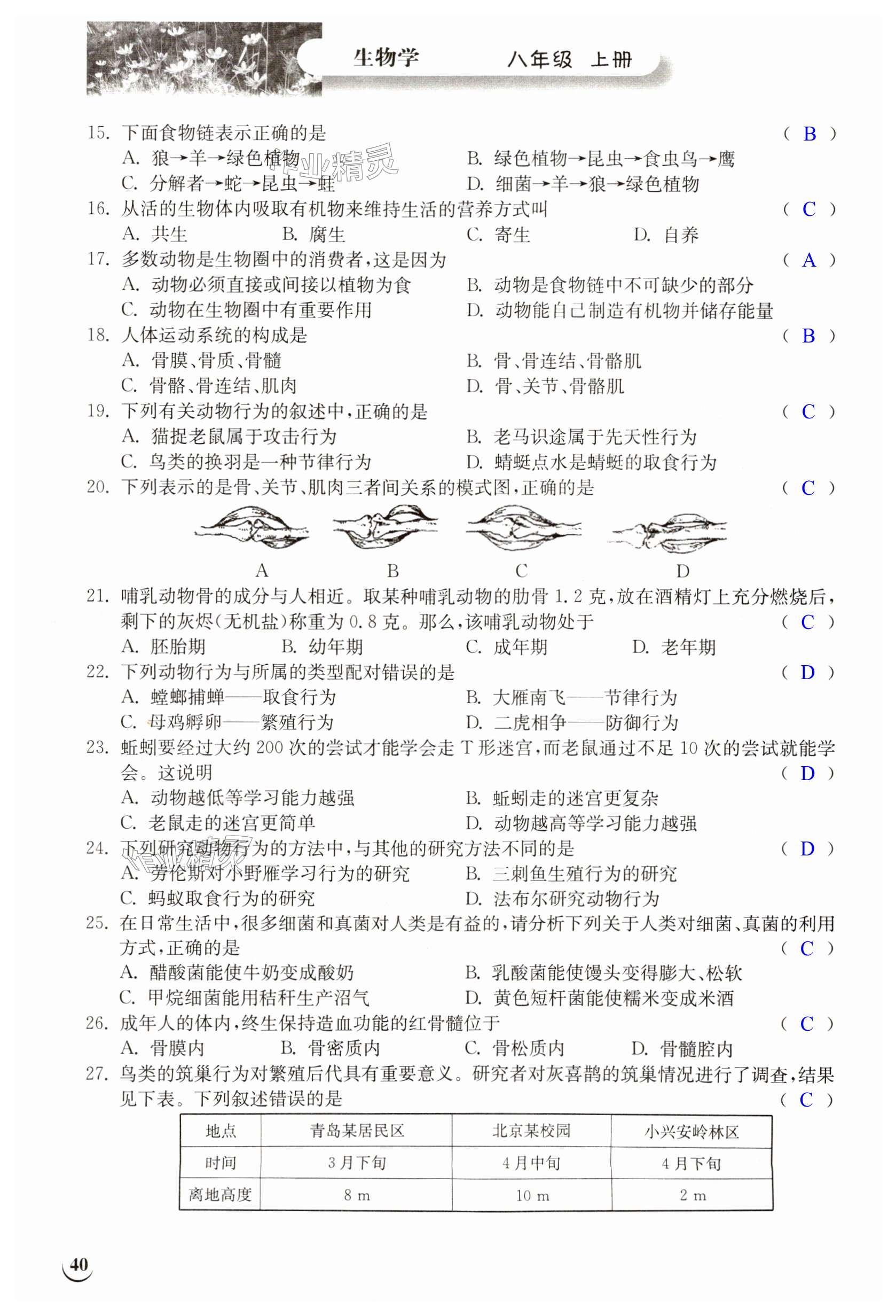 注:目前有些书本章节名称可能整理的还不是很完善,但都是按照顺序排列的,请同学们按照顺序仔细查找。练习册 2023年长江作业本同步练习册八年级生物上册北师大版 答案主要是用来给同学们做完题方便对答案用的,请勿直接抄袭。
