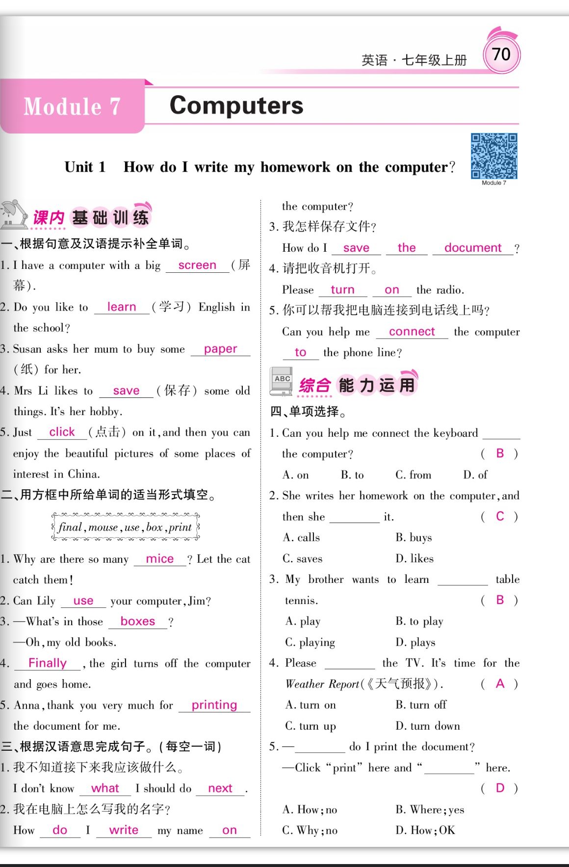 注:目前有些书本章节名称可能整理的还不是很完善,但都是按照顺序排列的,请同学们按照顺序仔细查找。练习册 2023年名校课堂内外七年级英语上册外研版 答案主要是用来给同学们做完题方便对答案用的,请勿直接抄袭。