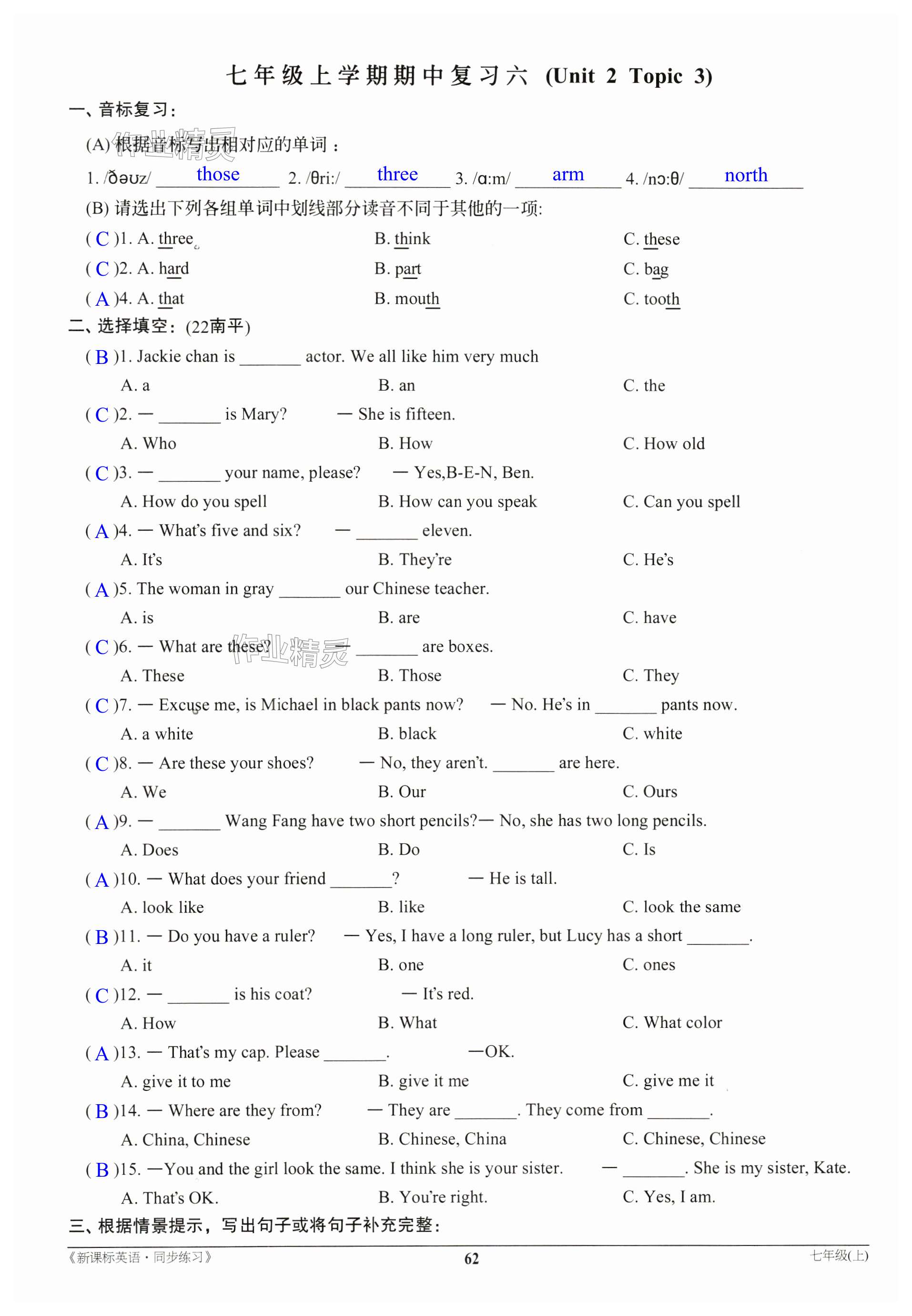 注:目前有些书本章节名称可能整理的还不是很完善,但都是按照顺序排列的,请同学们按照顺序仔细查找。练习册 2023年新课标同步练习七年级英语上册仁爱版 答案主要是用来给同学们做完题方便对答案用的,请勿直接抄袭。