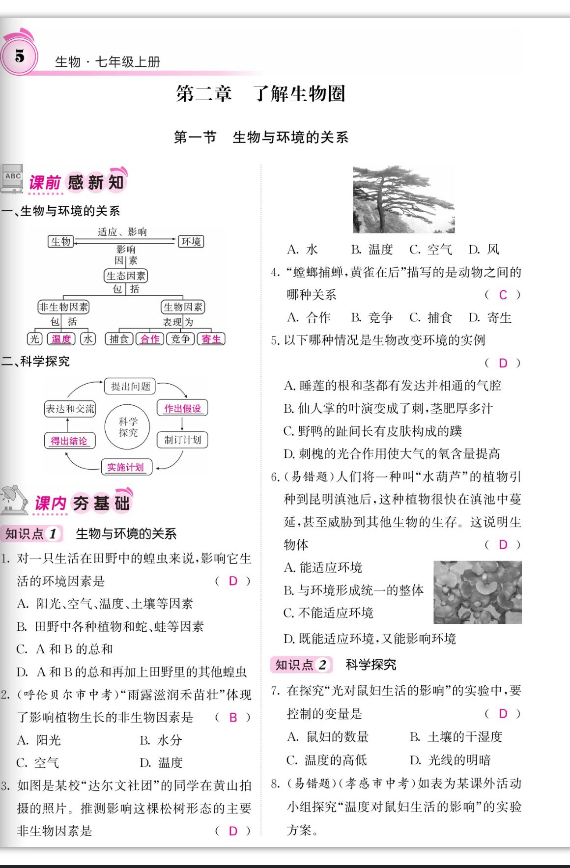 注:目前有些书本章节名称可能整理的还不是很完善,但都是按照顺序排列的,请同学们按照顺序仔细查找。练习册 2023年名校课堂内外七年级生物上册人教版 答案主要是用来给同学们做完题方便对答案用的,请勿直接抄袭。
