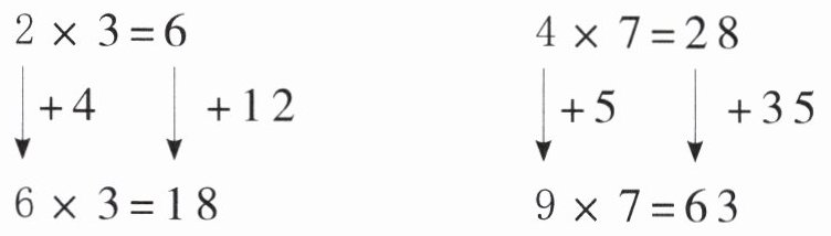 $\begin{aligned}2×3&= 6\\\downarrow +4&\quad\downarrow +12\\6×3&= 18\end{aligned} $