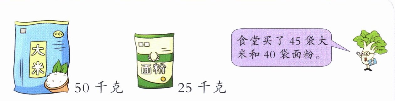 3. 从“条件”想起,可知每袋大米重50千克,每袋面粉重25千克,买45袋大米和40袋面粉,这样可以分别求出大米和面粉的总质量,最后将大米和面粉的总质量相加,可求出一共有多少千克;将大米和面粉的质量相减,就可以求出大米比面粉多多少千克。