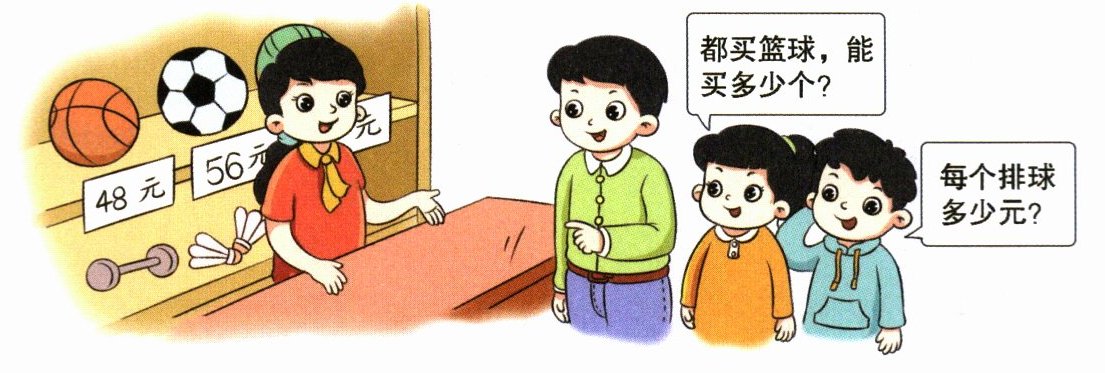 2. 本题也可以从“问题”想起,问题要求都买篮球,能买多少个?需要知道篮球的单价及总价,根据情境图可知篮球单价是48元,关键是求篮球的总价,而篮球的总价就是买6个足球或8个排球的总价,情境图中排球单价未知,但可知足球的单价是56元,所以56×6= 336(元),列式如下:
