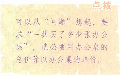 点拨:可以从“问题”想起,要求“一共买了多少张办公桌”,就必须用办公桌的总价除以办公桌的单价。