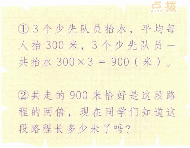 ①3个少先队员抬水,平均每人抬300米,3个少先队员一共抬水300×3 = 900(米)。