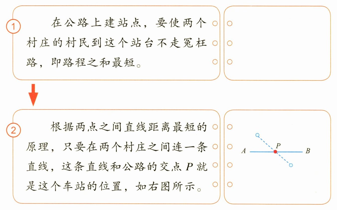 根据两点之间直线距离最短的原理,只要在两个村庄之间连一条直线,这条直线和公路的交点 $ P $ 就是这个车站的位置,如右图所示。