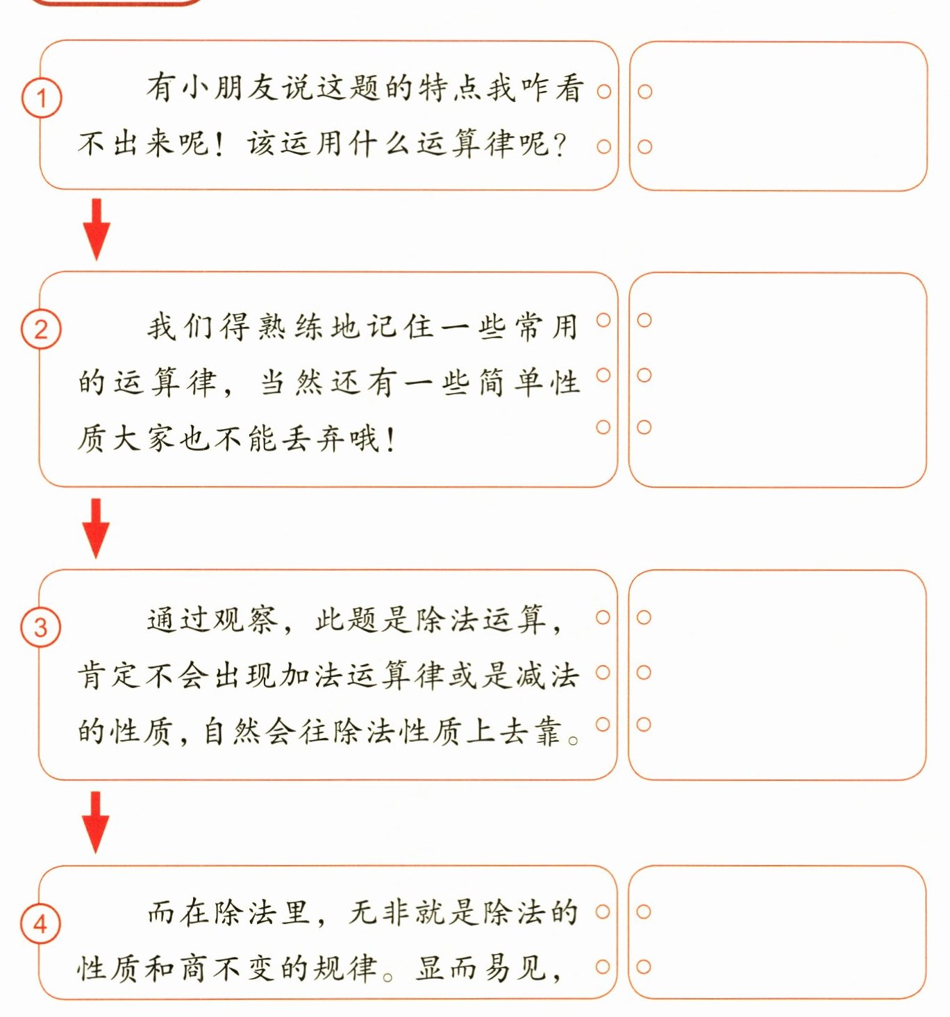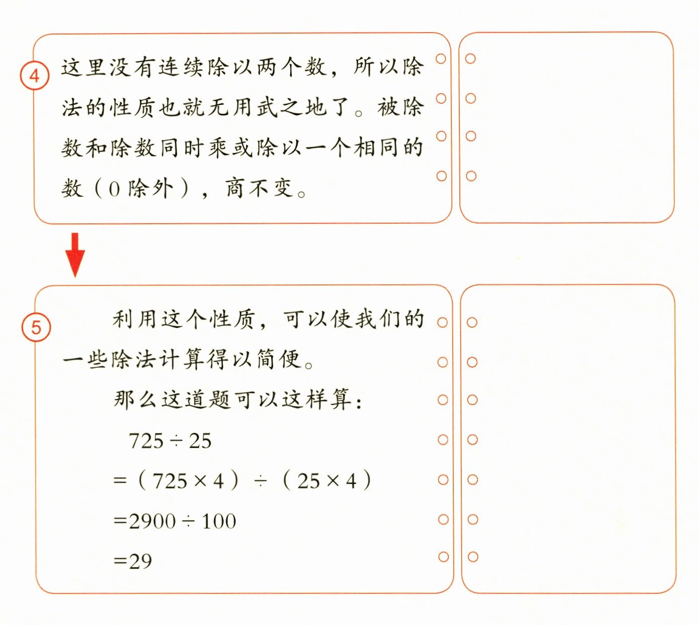 4. 而在除法里,无非就是除法的性质和商不变的规律。显而易见,这里没有连续除以两个数,所以除法的性质也就无用武之地了。被除数和除数同时乘或除以一个相同的数($0$除外),商不变。