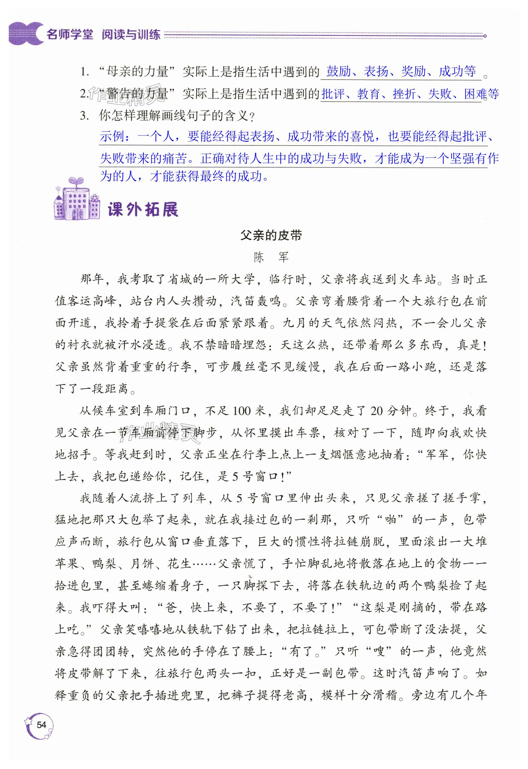 注:目前有些书本章节名称可能整理的还不是很完善,但都是按照顺序排列的,请同学们按照顺序仔细查找。练习册 2023年阅读与训练名师学堂五年级语文上册人教版 答案主要是用来给同学们做完题方便对答案用的,请勿直接抄袭。
