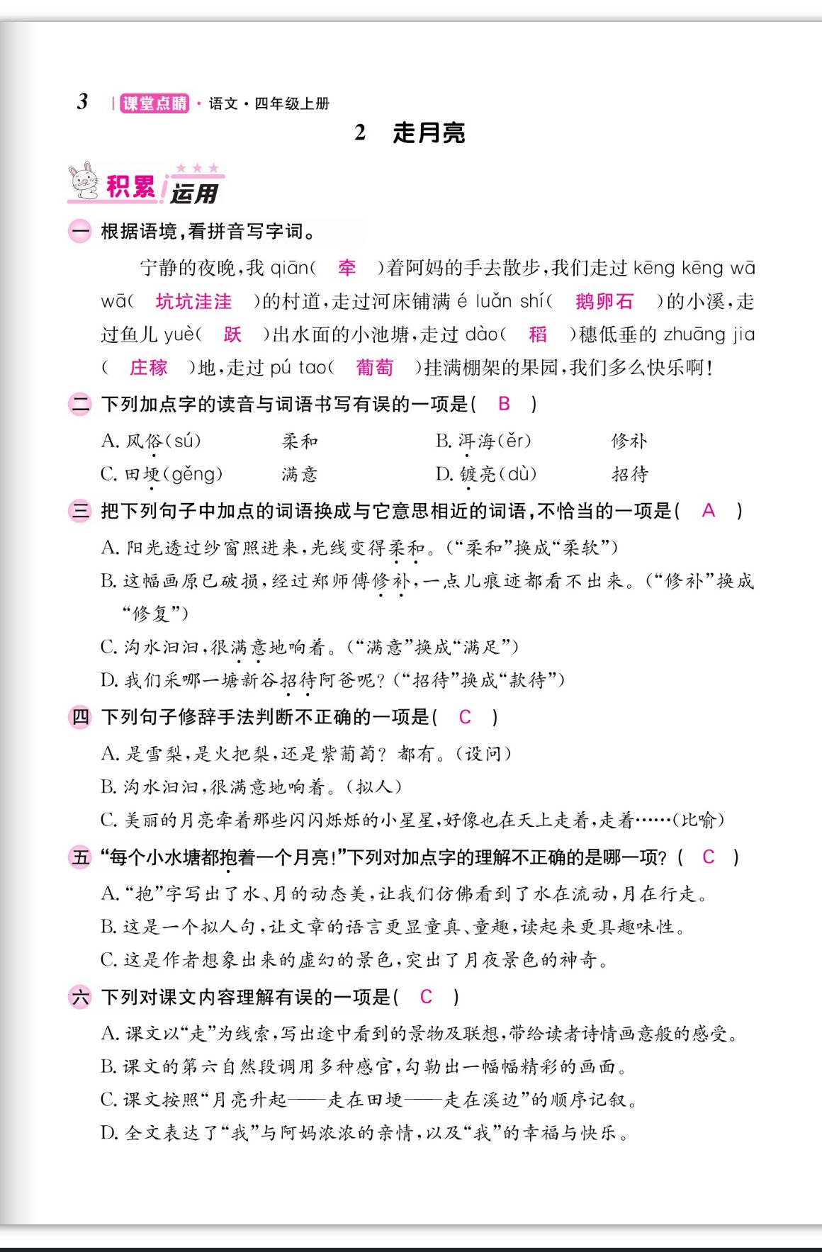 注:目前有些书本章节名称可能整理的还不是很完善,但都是按照顺序排列的,请同学们按照顺序仔细查找。练习册 2023年课堂点睛四年级语文上册人教版福建专版 答案主要是用来给同学们做完题方便对答案用的,请勿直接抄袭。