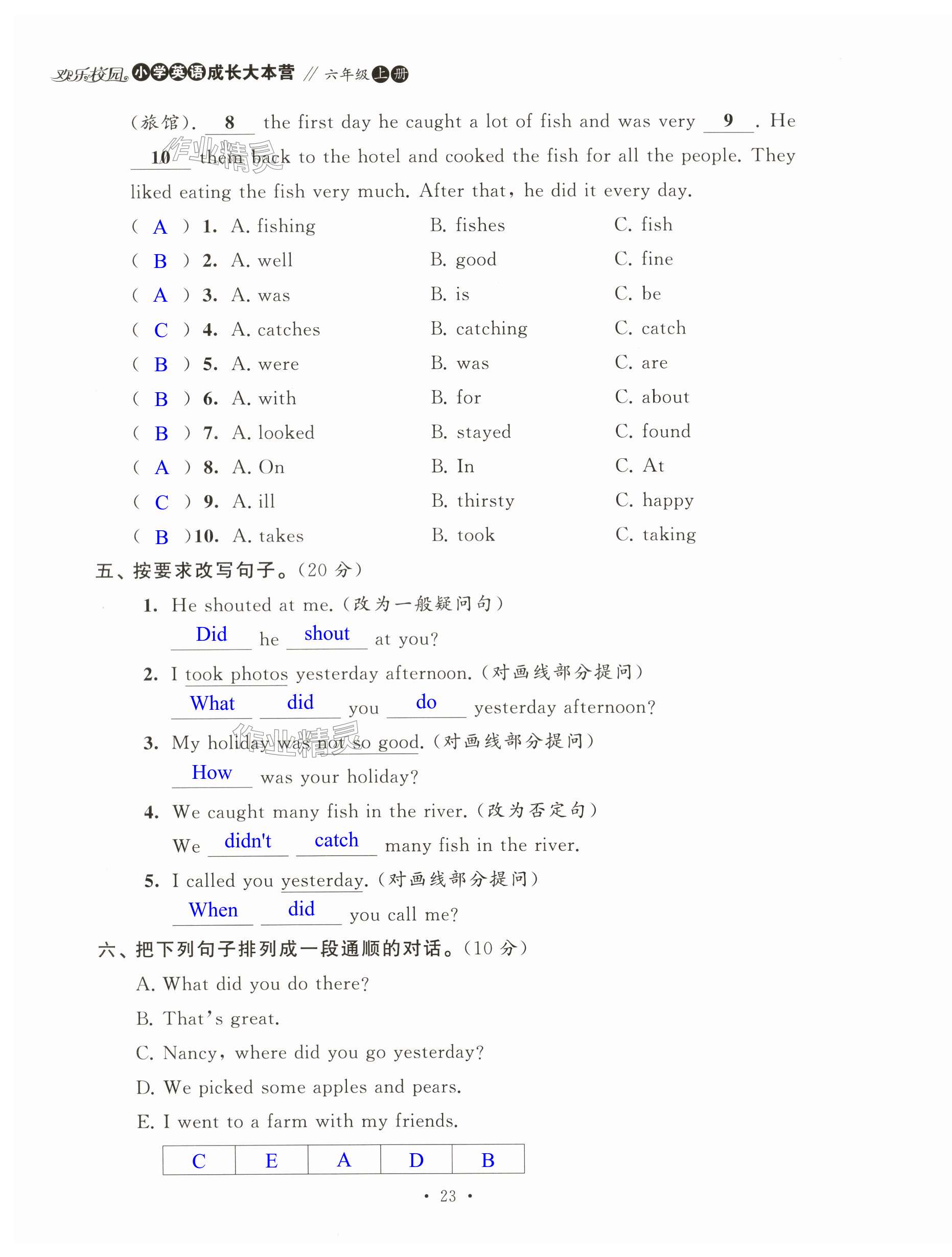 注:目前有些书本章节名称可能整理的还不是很完善,但都是按照顺序排列的,请同学们按照顺序仔细查找。练习册 2023年欢乐校园成长大本营六年级英语上册译林版 答案主要是用来给同学们做完题方便对答案用的,请勿直接抄袭。
