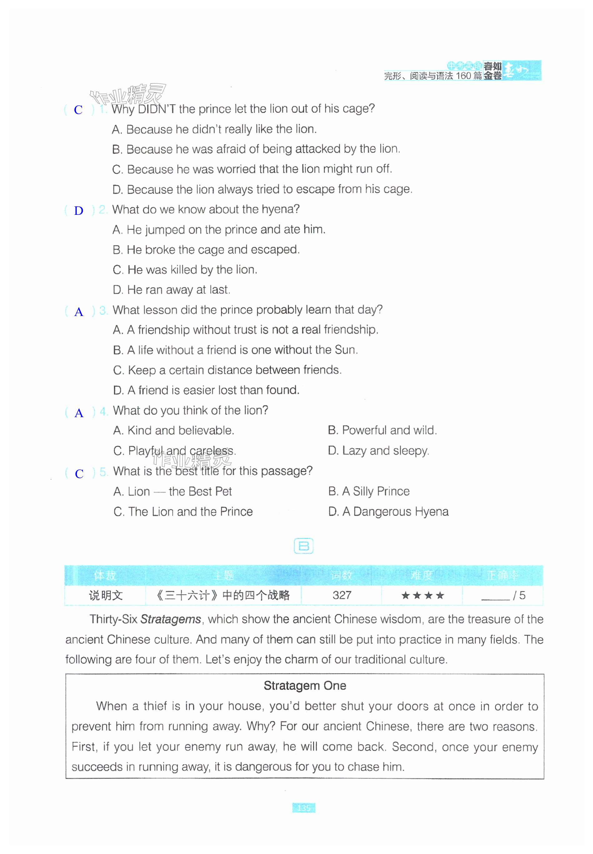 注:目前有些书本章节名称可能整理的还不是很完善,但都是按照顺序排列的,请同学们按照顺序仔细查找。练习册 2024年春如金卷英语中考完形阅读与语法160篇 答案主要是用来给同学们做完题方便对答案用的,请勿直接抄袭。