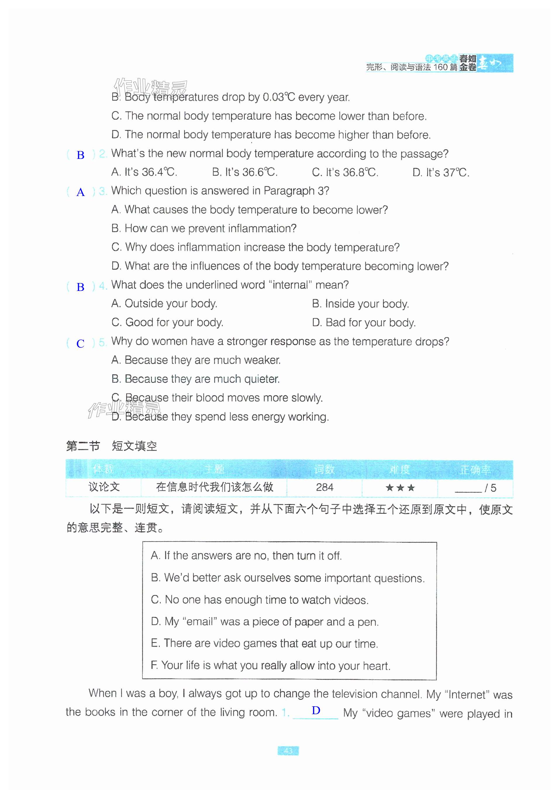 注:目前有些书本章节名称可能整理的还不是很完善,但都是按照顺序排列的,请同学们按照顺序仔细查找。练习册 2024年春如金卷英语中考完形阅读与语法160篇 答案主要是用来给同学们做完题方便对答案用的,请勿直接抄袭。