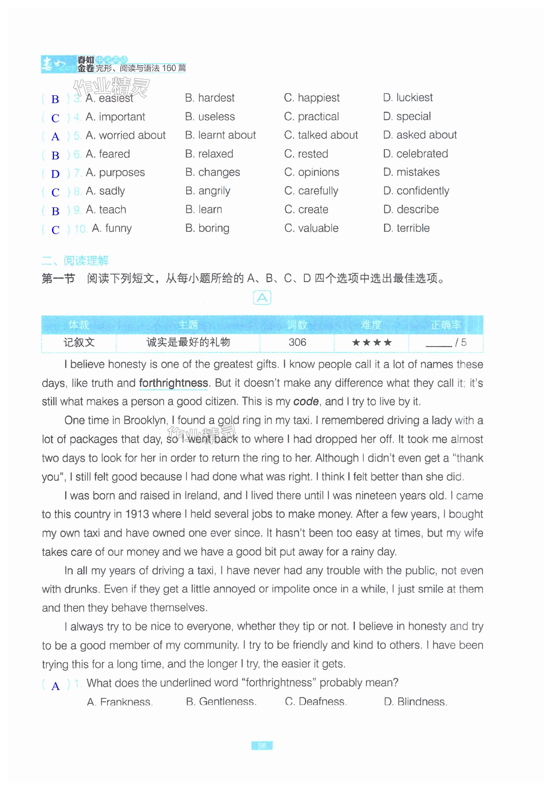 注:目前有些书本章节名称可能整理的还不是很完善,但都是按照顺序排列的,请同学们按照顺序仔细查找。练习册 2024年春如金卷英语中考完形阅读与语法160篇 答案主要是用来给同学们做完题方便对答案用的,请勿直接抄袭。