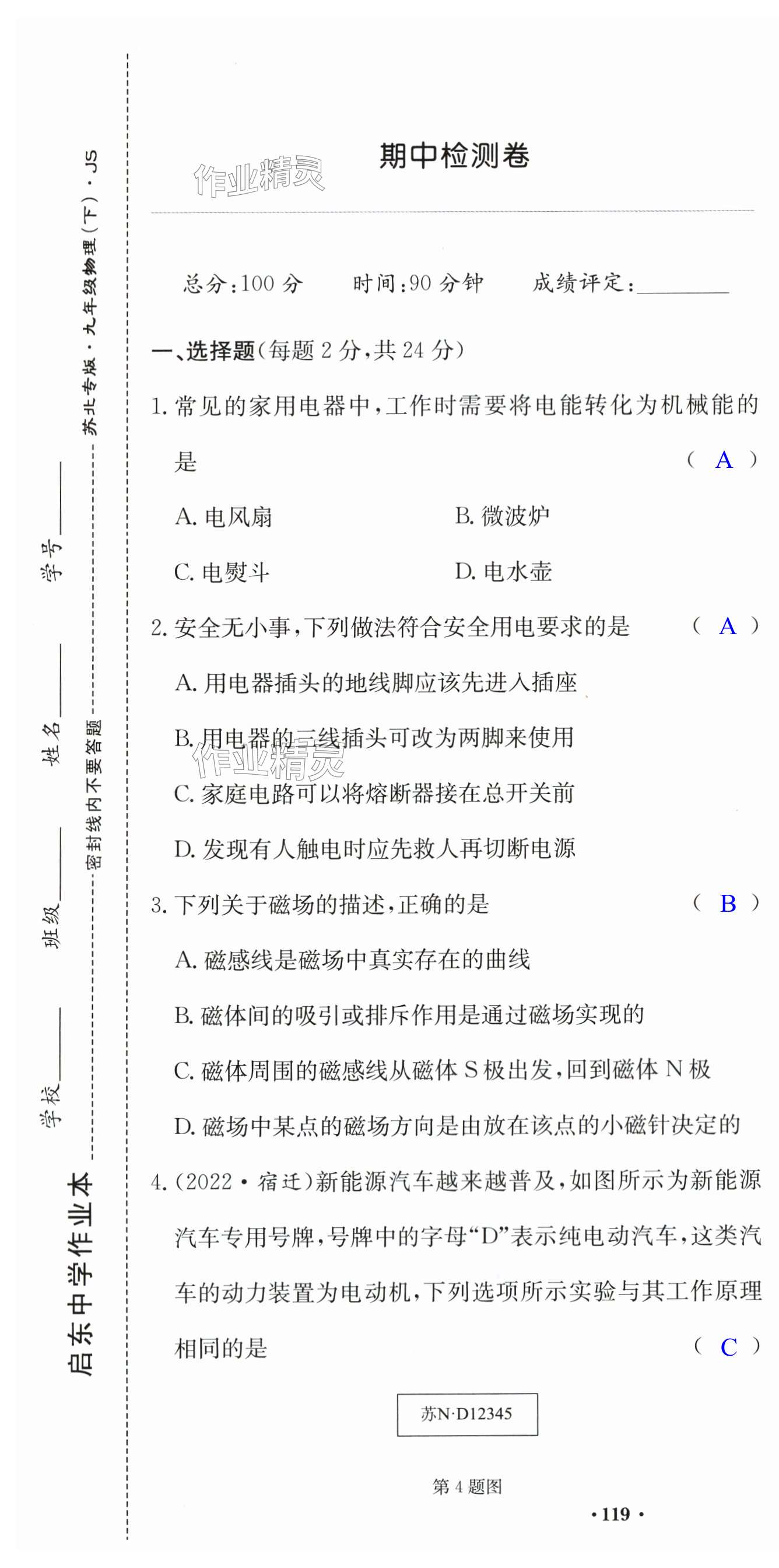 2024年启东中学作业本九年级物理下册苏科版苏北专版