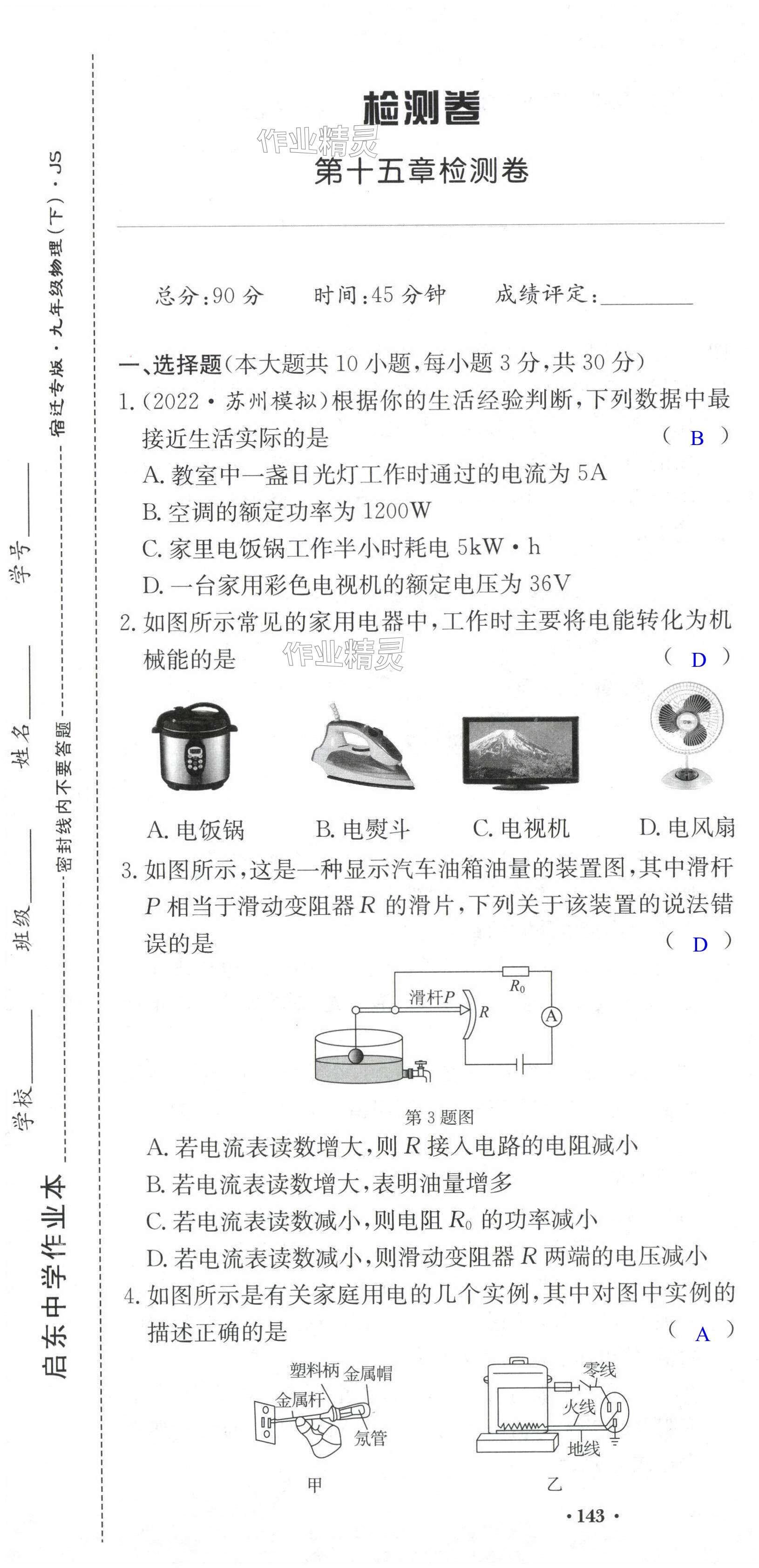 2024年启东中学作业本九年级物理下册苏科版宿迁专版