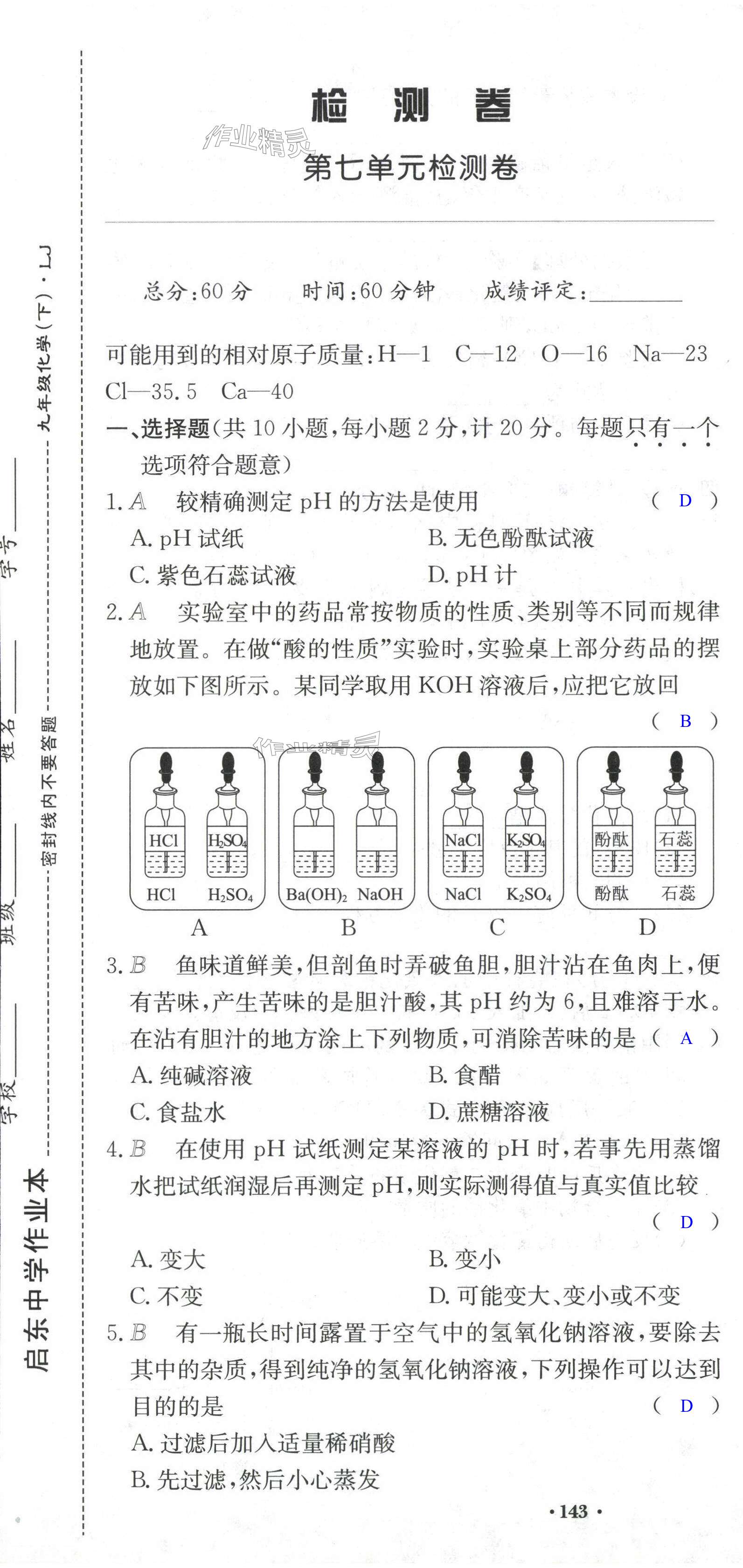 注:目前有些书本章节名称可能整理的还不是很完善,但都是按照顺序排列的,请同学们按照顺序仔细查找。练习册 2024年启东中学作业本九年级化学下册鲁教版宿迁专版 答案主要是用来给同学们做完题方便对答案用的,请勿直接抄袭。