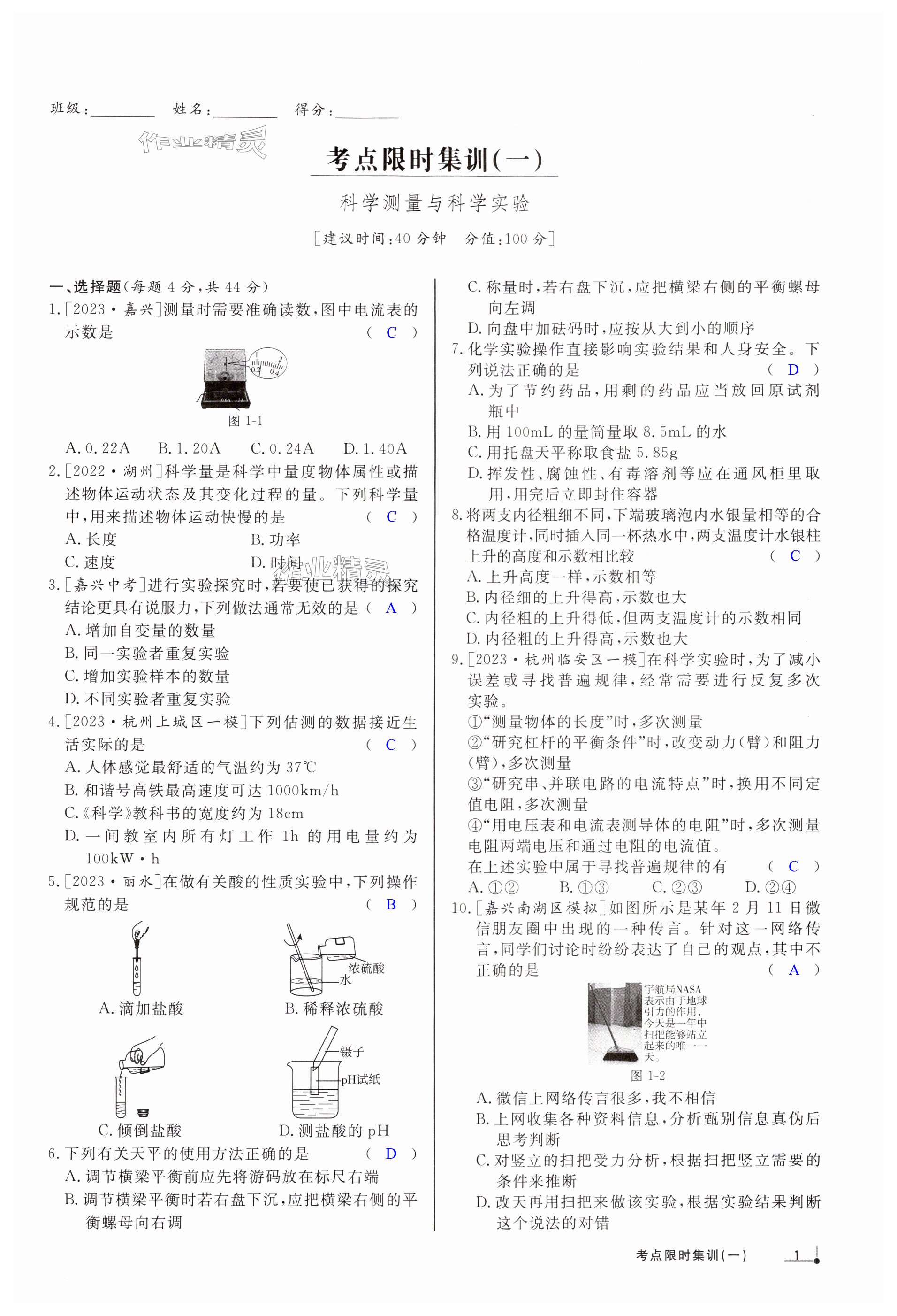 2024年浙派名师中考方略分类集训科学浙教版浙江专版