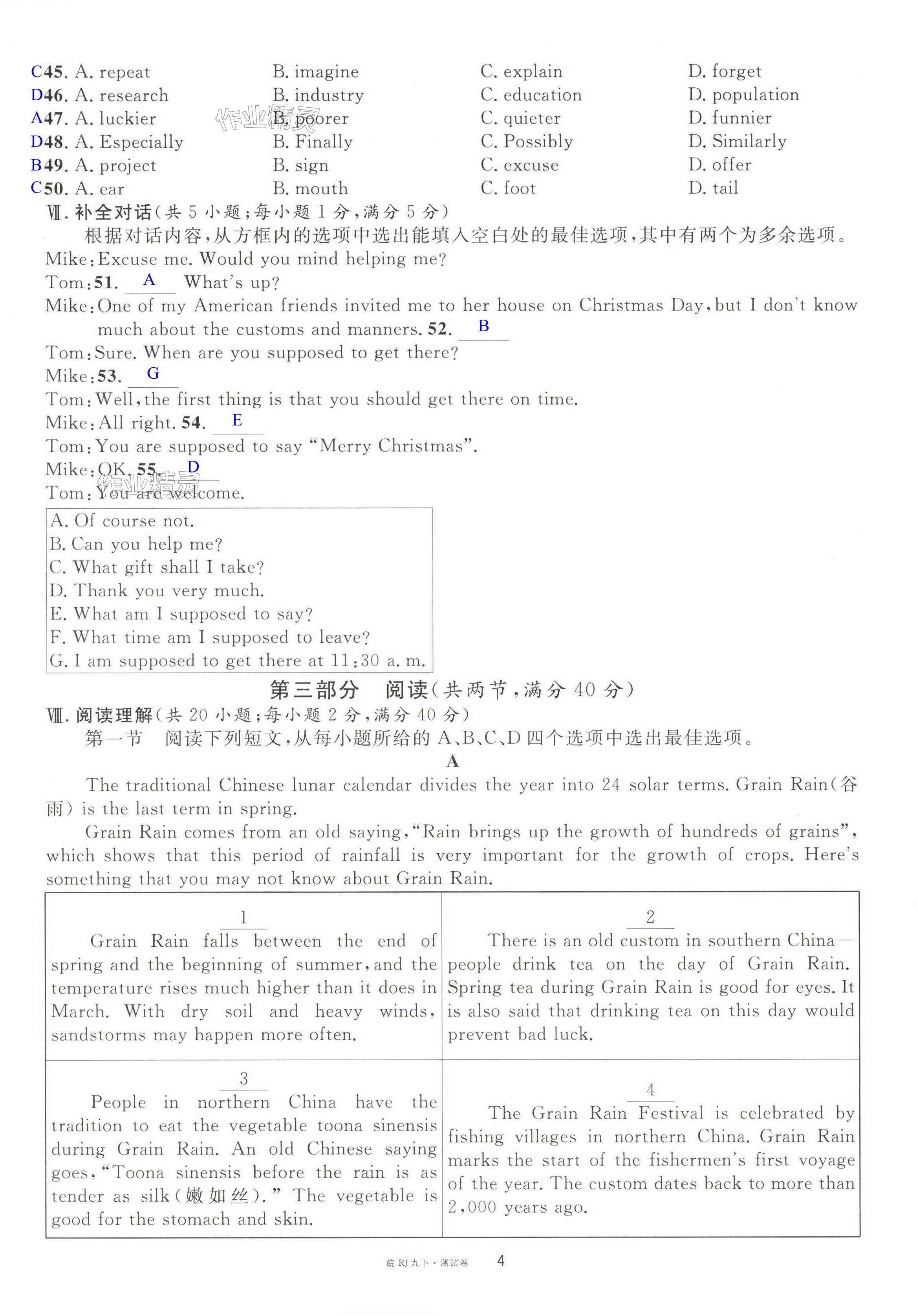 注:目前有些书本章节名称可能整理的还不是很完善,但都是按照顺序排列的,请同学们按照顺序仔细查找。练习册 2024年名校课堂九年级英语下册人教版安徽专版 答案主要是用来给同学们做完题方便对答案用的,请勿直接抄袭。