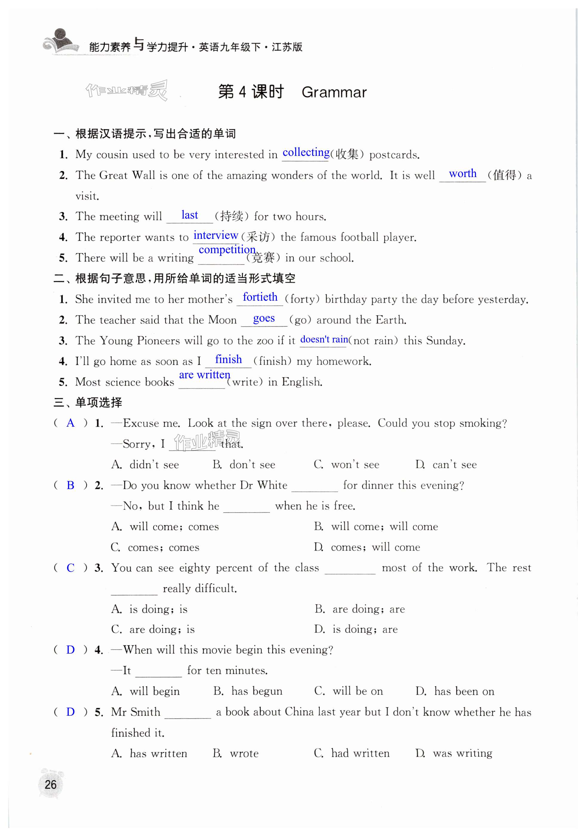 注:目前有些书本章节名称可能整理的还不是很完善,但都是按照顺序排列的,请同学们按照顺序仔细查找。练习册 2024年能力素养与学力提升九年级英语下册译林版 答案主要是用来给同学们做完题方便对答案用的,请勿直接抄袭。