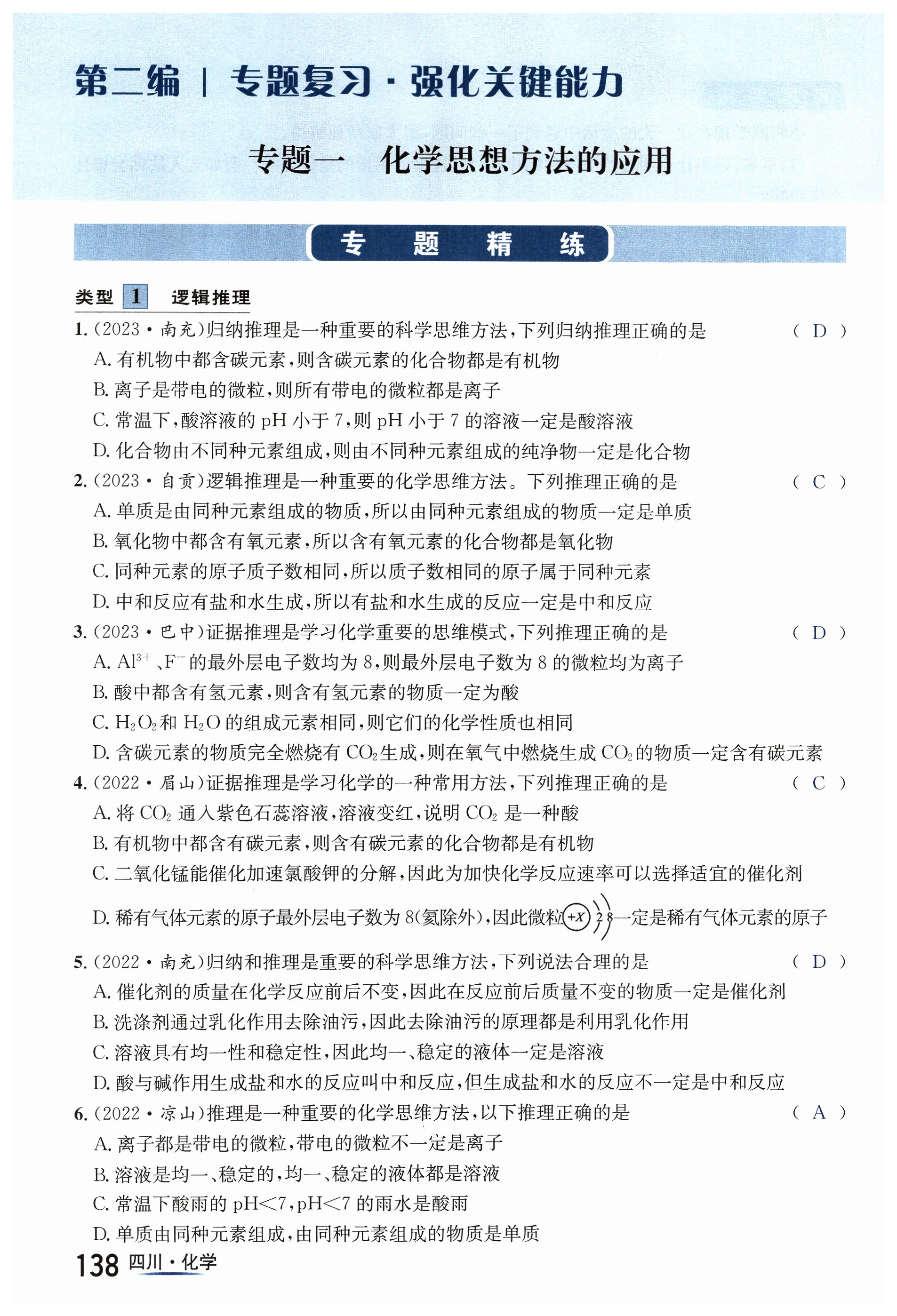注:目前有些书本章节名称可能整理的还不是很完善,但都是按照顺序排列的,请同学们按照顺序仔细查找。练习册 2024年中考2号化学四川专版 答案主要是用来给同学们做完题方便对答案用的,请勿直接抄袭。