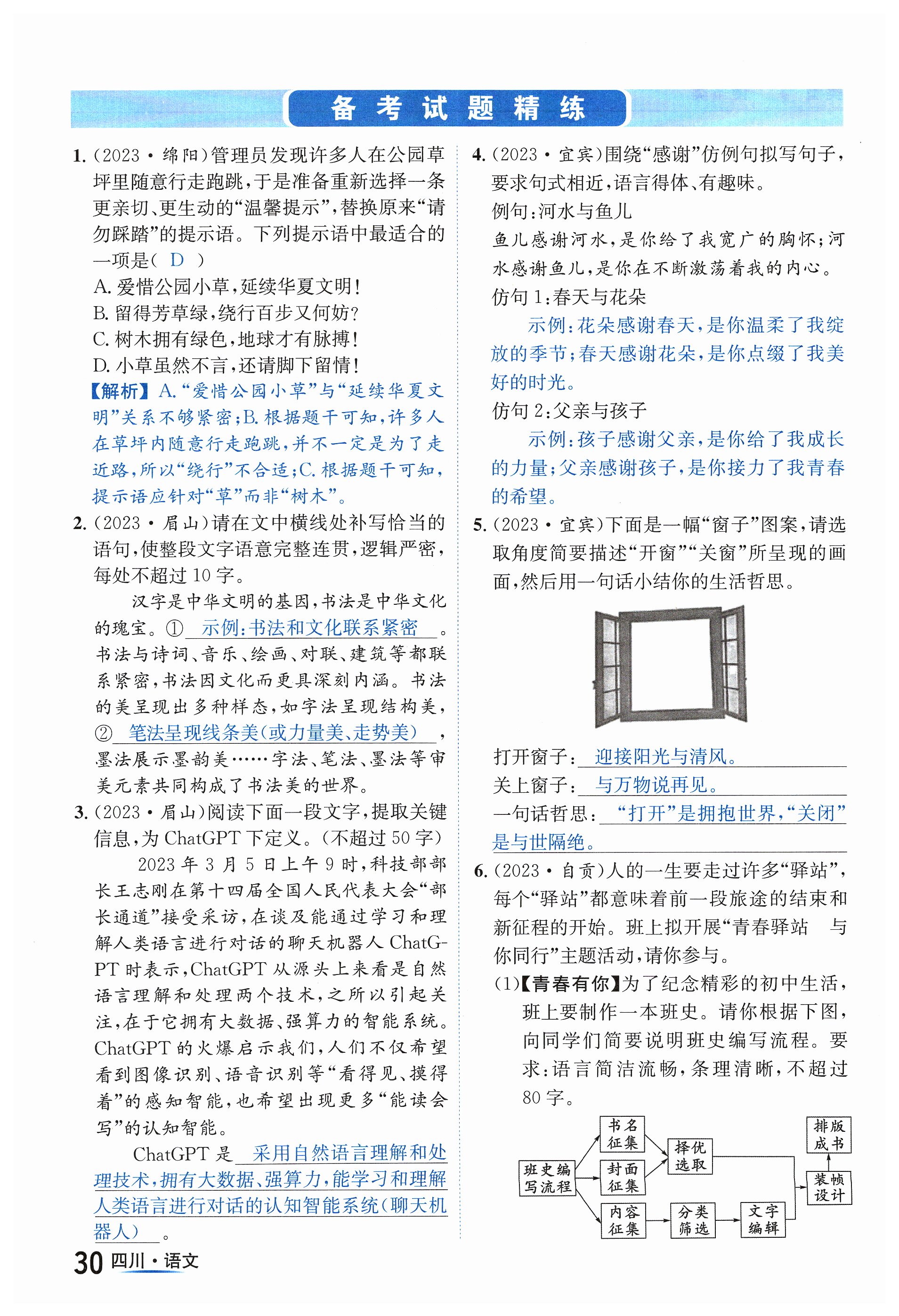 注:目前有些书本章节名称可能整理的还不是很完善,但都是按照顺序排列的,请同学们按照顺序仔细查找。练习册 2024年中考2号语文四川专版 答案主要是用来给同学们做完题方便对答案用的,请勿直接抄袭。