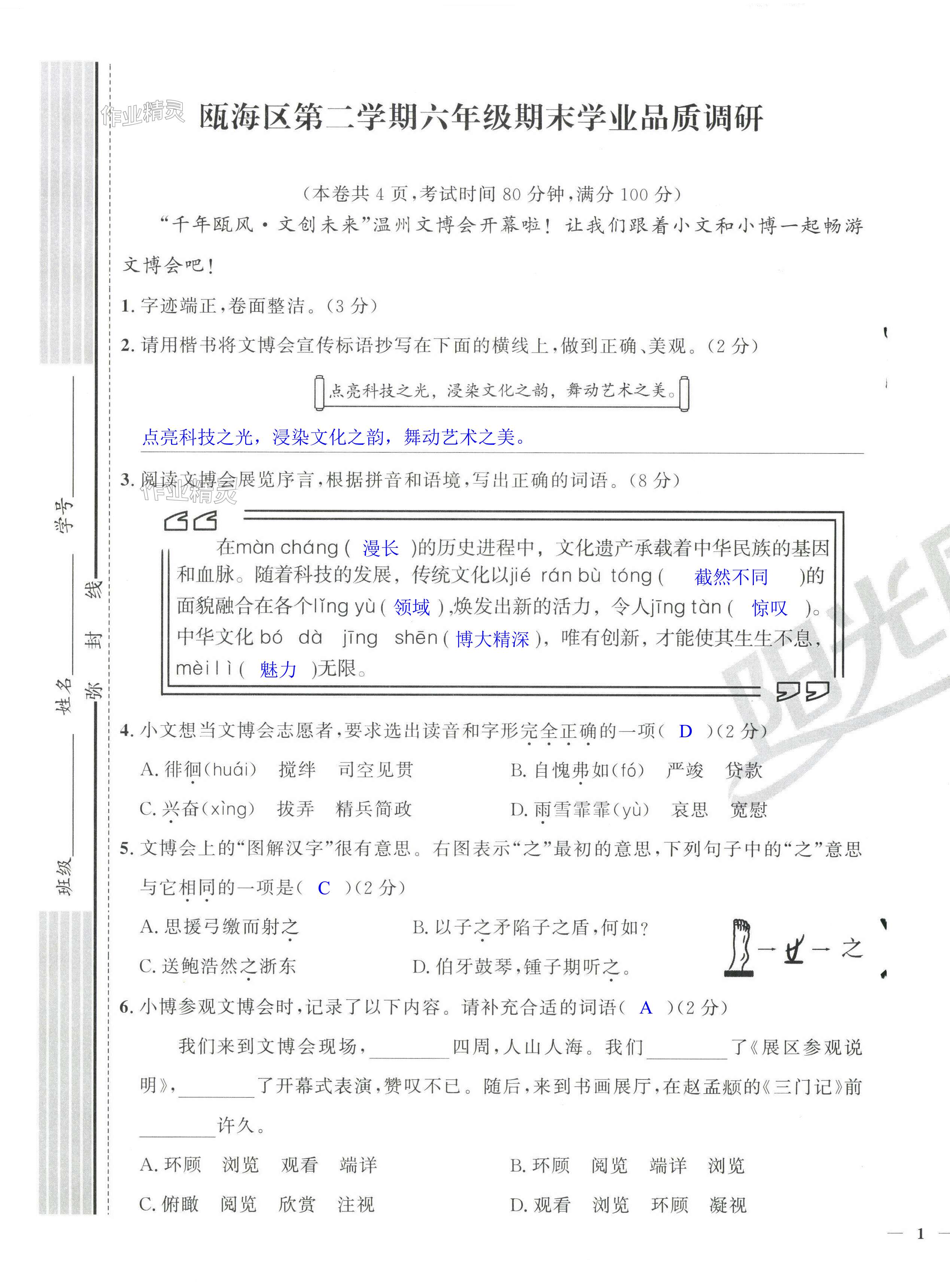 注:目前有些书本章节名称可能整理的还不是很完善,但都是按照顺序排列的,请同学们按照顺序仔细查找。练习册 2024年阳光同学课时达标训练六年级语文下册人教版浙江专版 答案主要是用来给同学们做完题方便对答案用的,请勿直接抄袭。