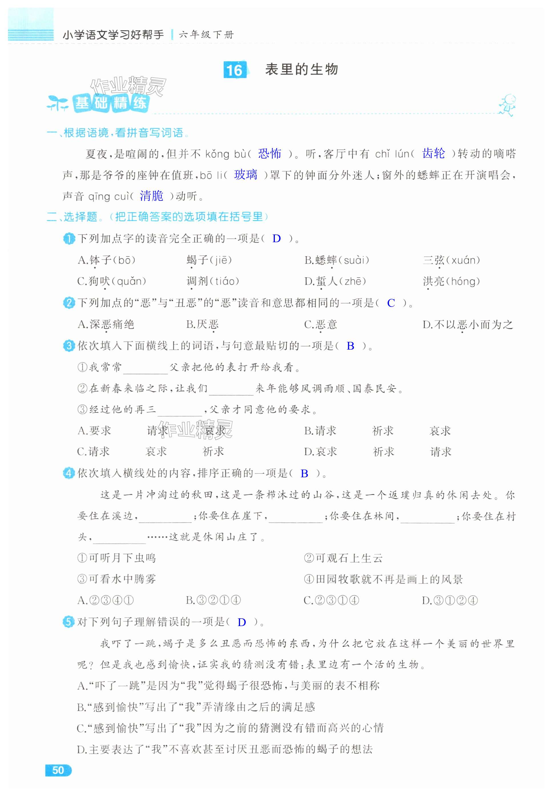 注:目前有些书本章节名称可能整理的还不是很完善,但都是按照顺序排列的,请同学们按照顺序仔细查找。练习册 2024年小学学习好帮手六年级语文下册人教版 答案主要是用来给同学们做完题方便对答案用的,请勿直接抄袭。
