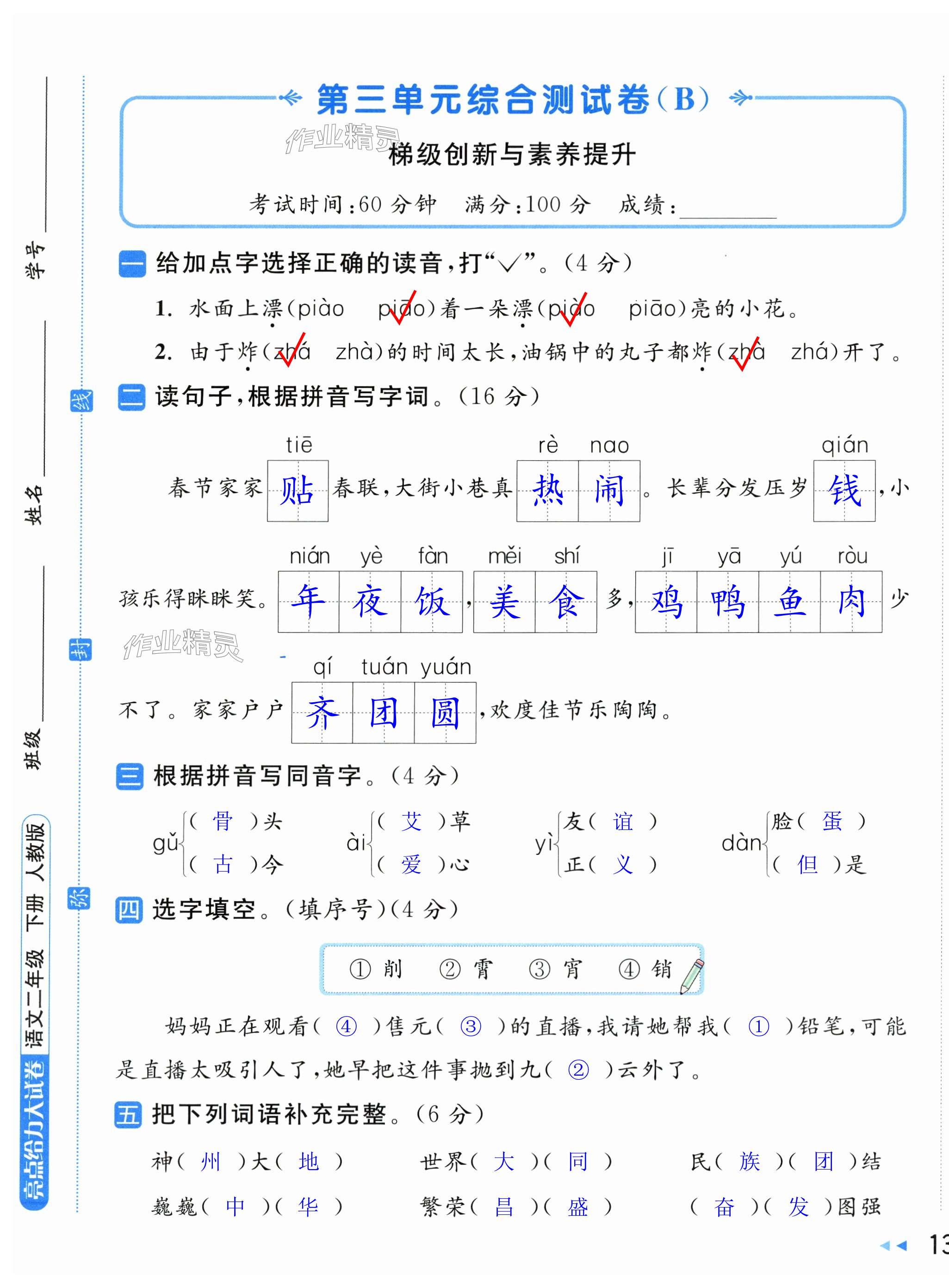 注:目前有些书本章节名称可能整理的还不是很完善,但都是按照顺序排列的,请同学们按照顺序仔细查找。练习册 2024年亮点给力大试卷二年级语文下册人教版 答案主要是用来给同学们做完题方便对答案用的,请勿直接抄袭。
