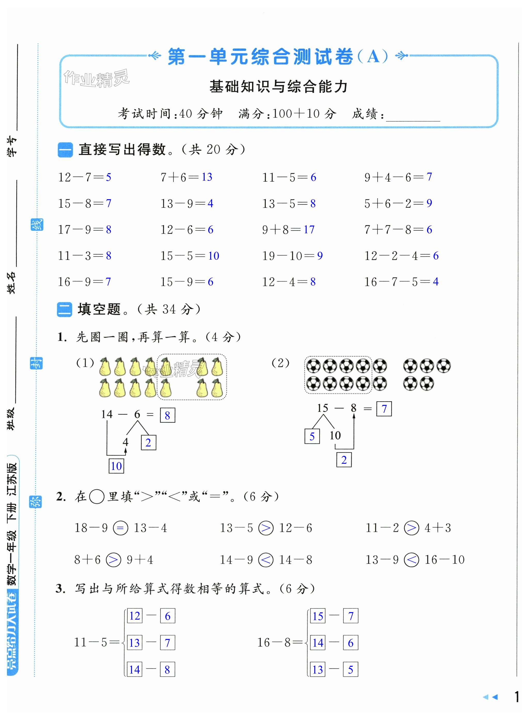 注:目前有些书本章节名称可能整理的还不是很完善,但都是按照顺序排列的,请同学们按照顺序仔细查找。练习册 2024年亮点给力大试卷一年级数学下册苏教版 答案主要是用来给同学们做完题方便对答案用的,请勿直接抄袭。